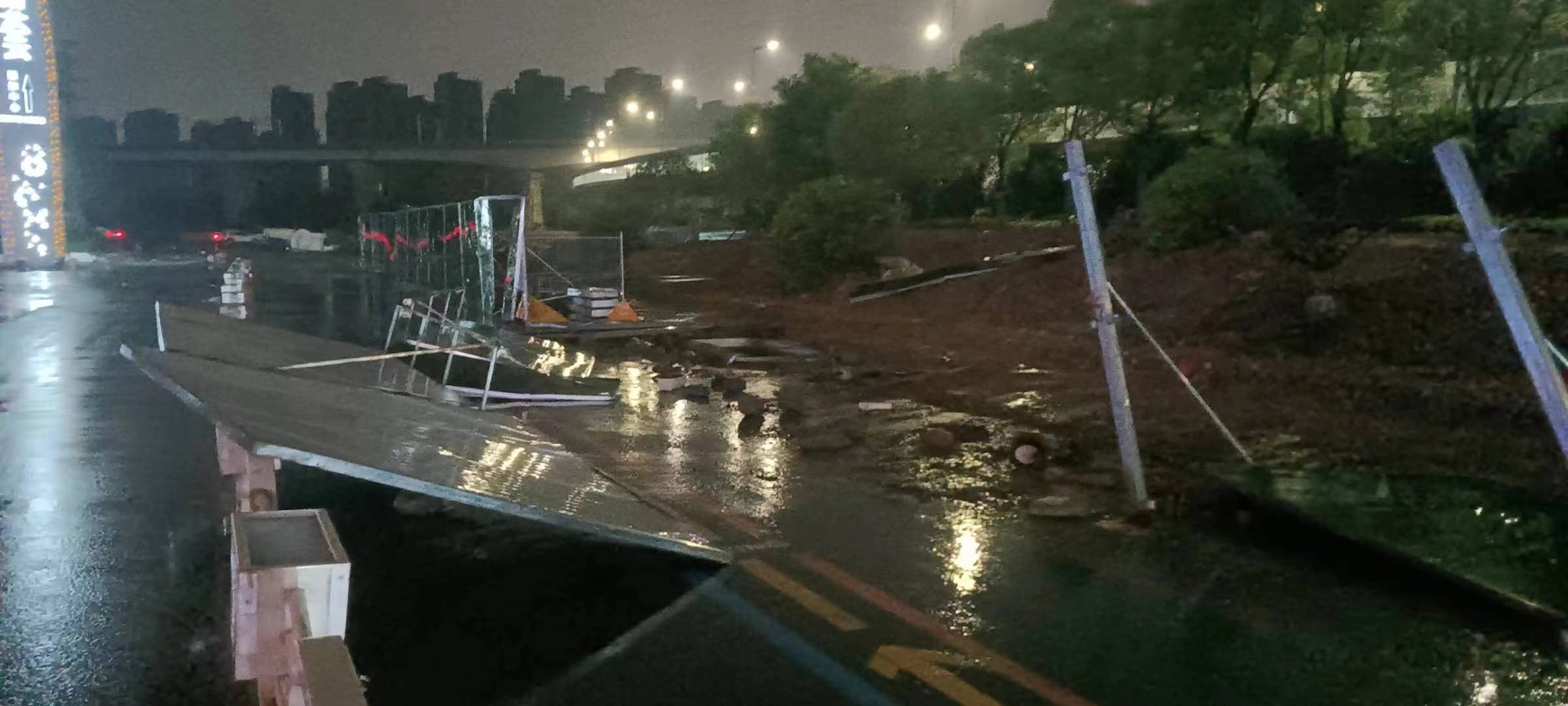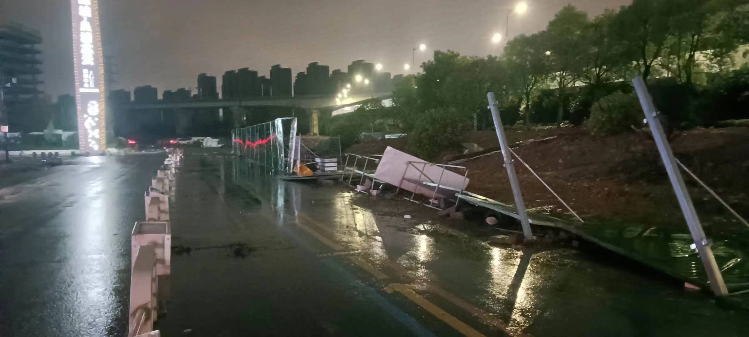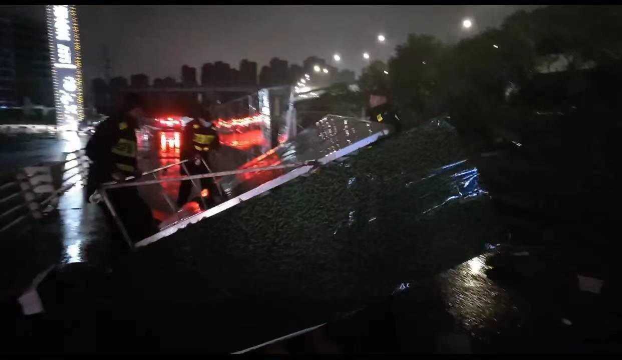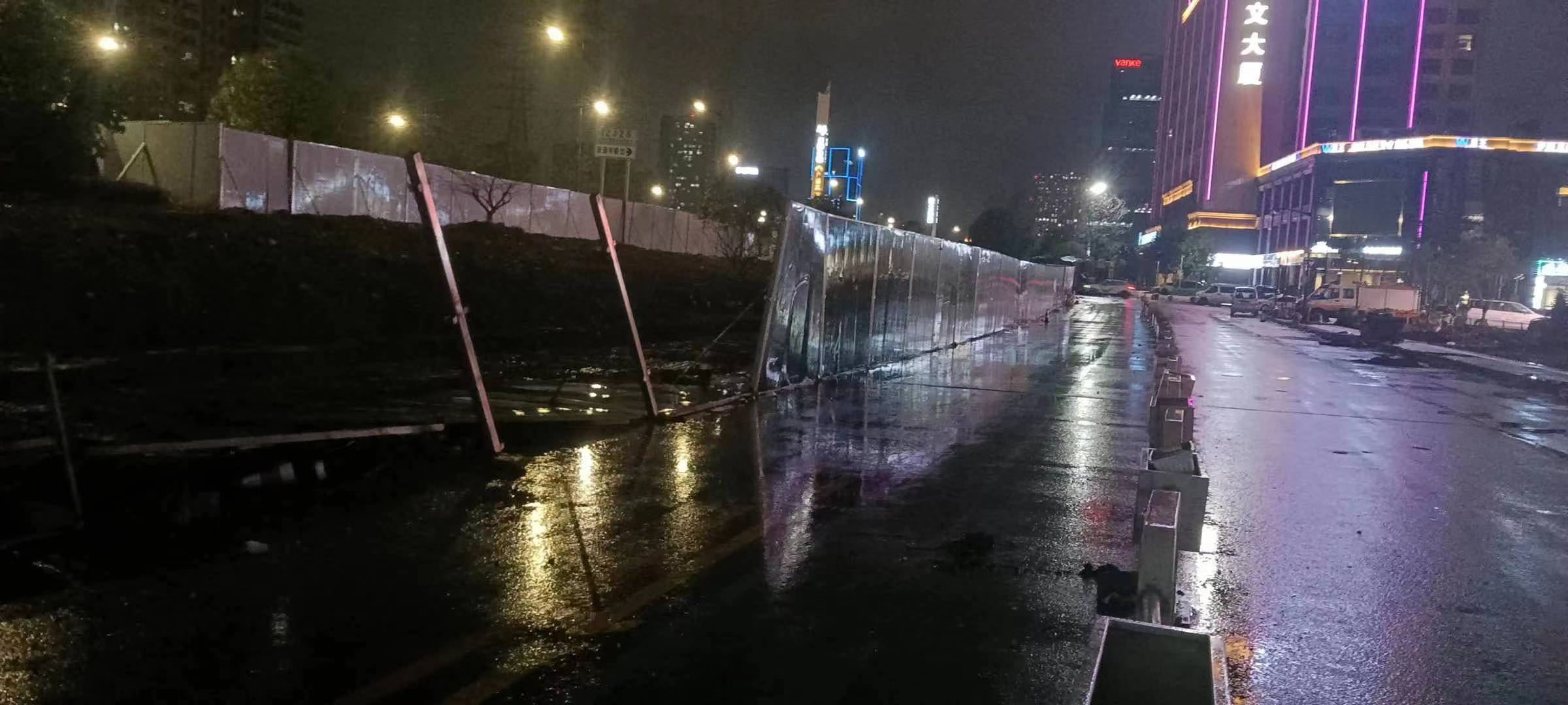 當日20:12,公司員工黃華和郭子威在嚴村里路古墩路口巡邏時(shí),看到馬路邊施工的綠色圍擋被風(fēng)吹倒,占據半幅車(chē)道,嚴重影響車(chē)輛通行,而當時(shí)正下著(zhù)大雨,再加上天色已暗,存在著(zhù)極大的安全隱患。