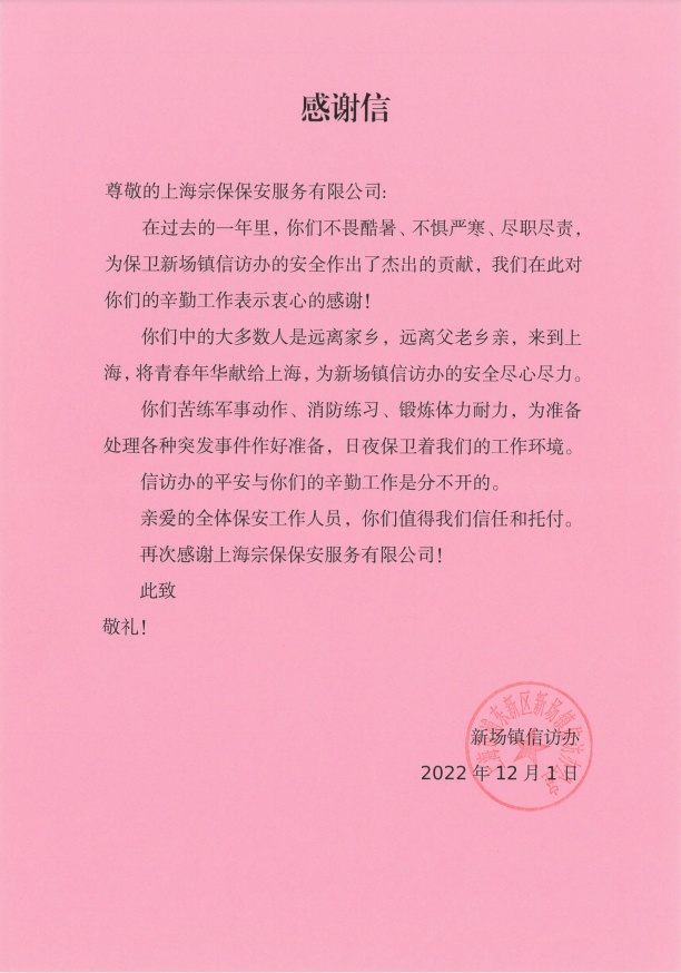 一封洋溢著(zhù)贊揚的感謝信,既是甲方單位對宗保公司員工工作成效的肯定,也是對宗保公司員工的鞭策和激勵。大家表示,將砥礪前行、再接再厲,持續為新場(chǎng)鎮信訪(fǎng)工作提供高效優(yōu)質(zhì)的安保服務(wù)。