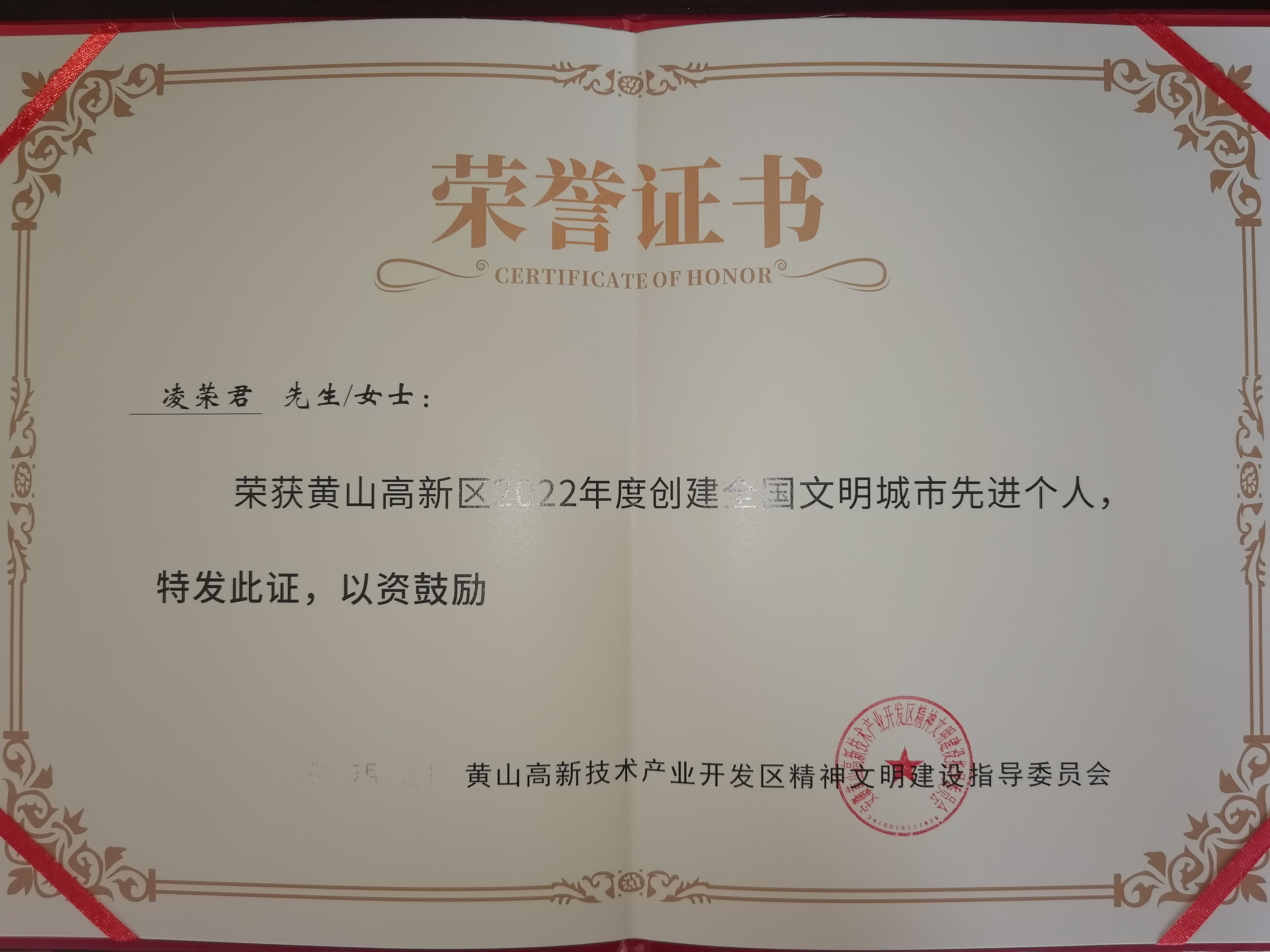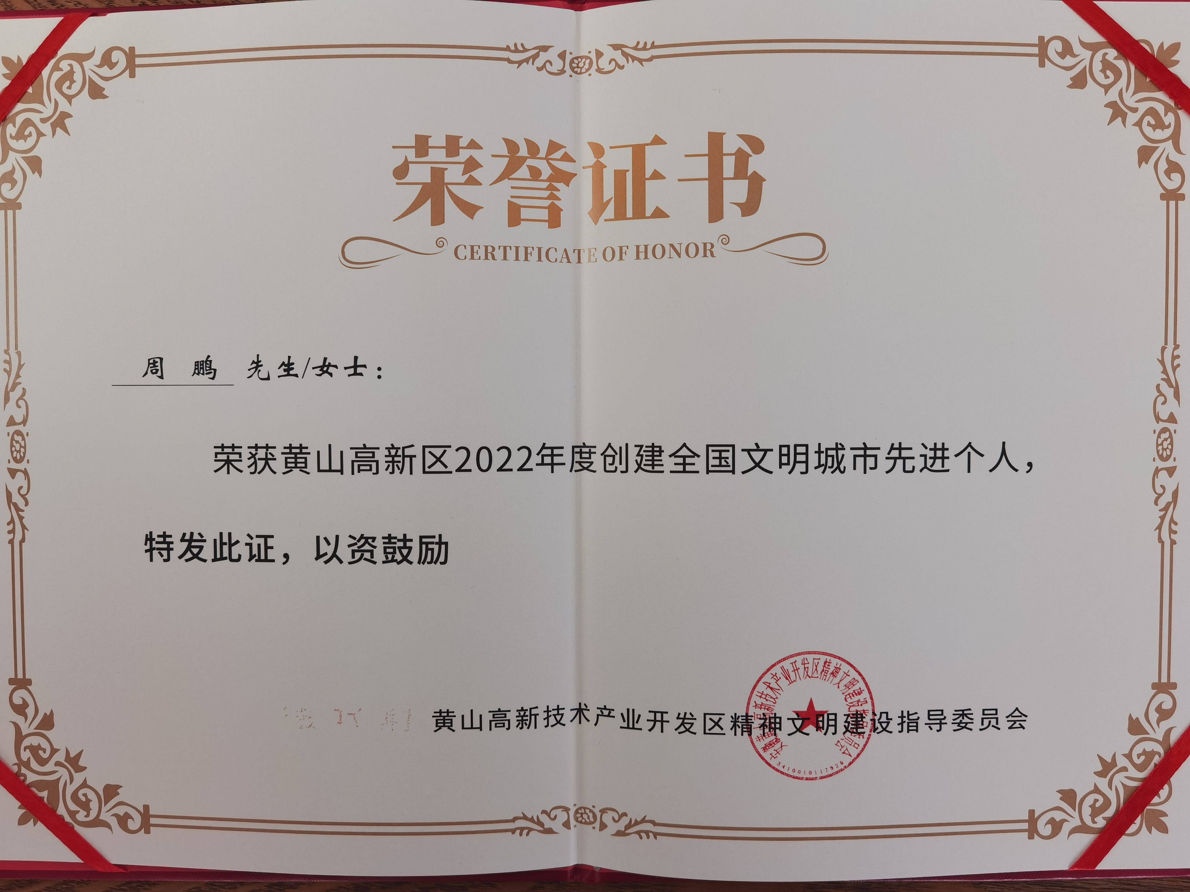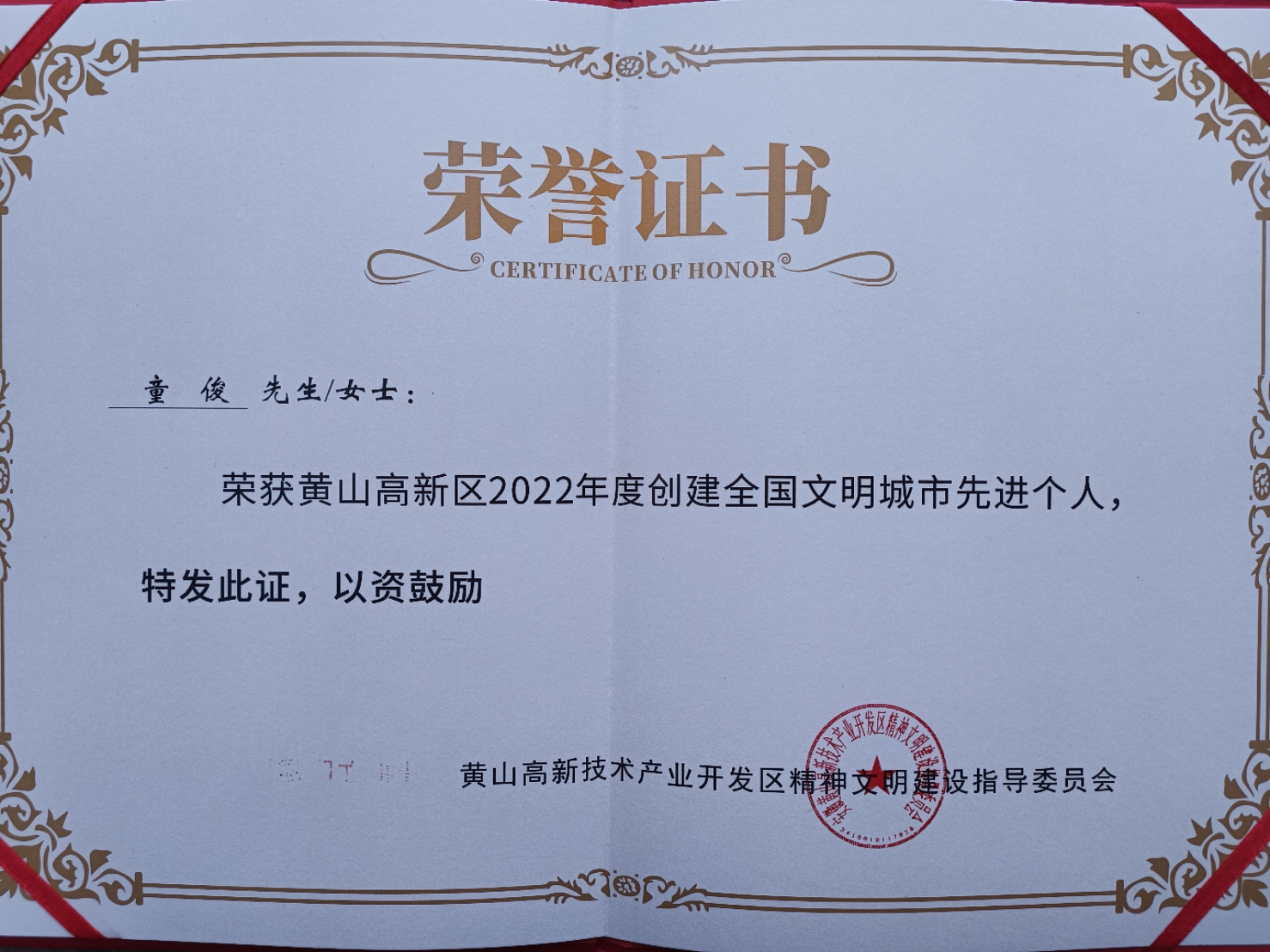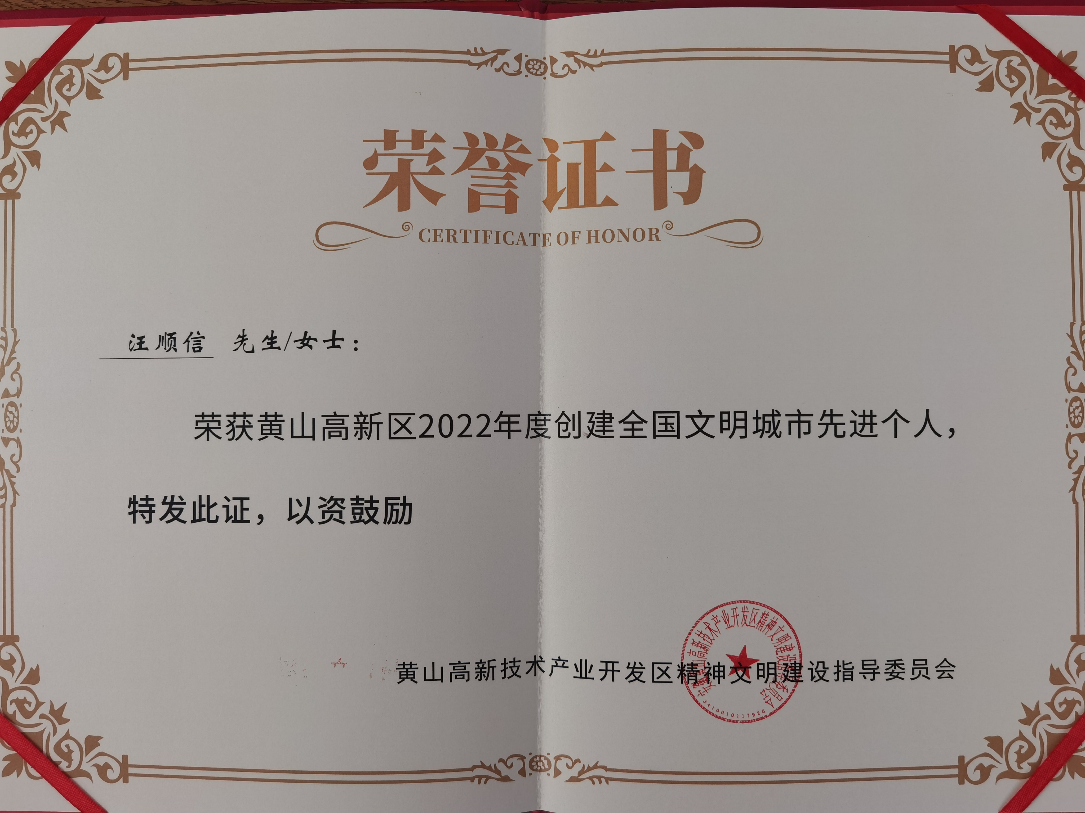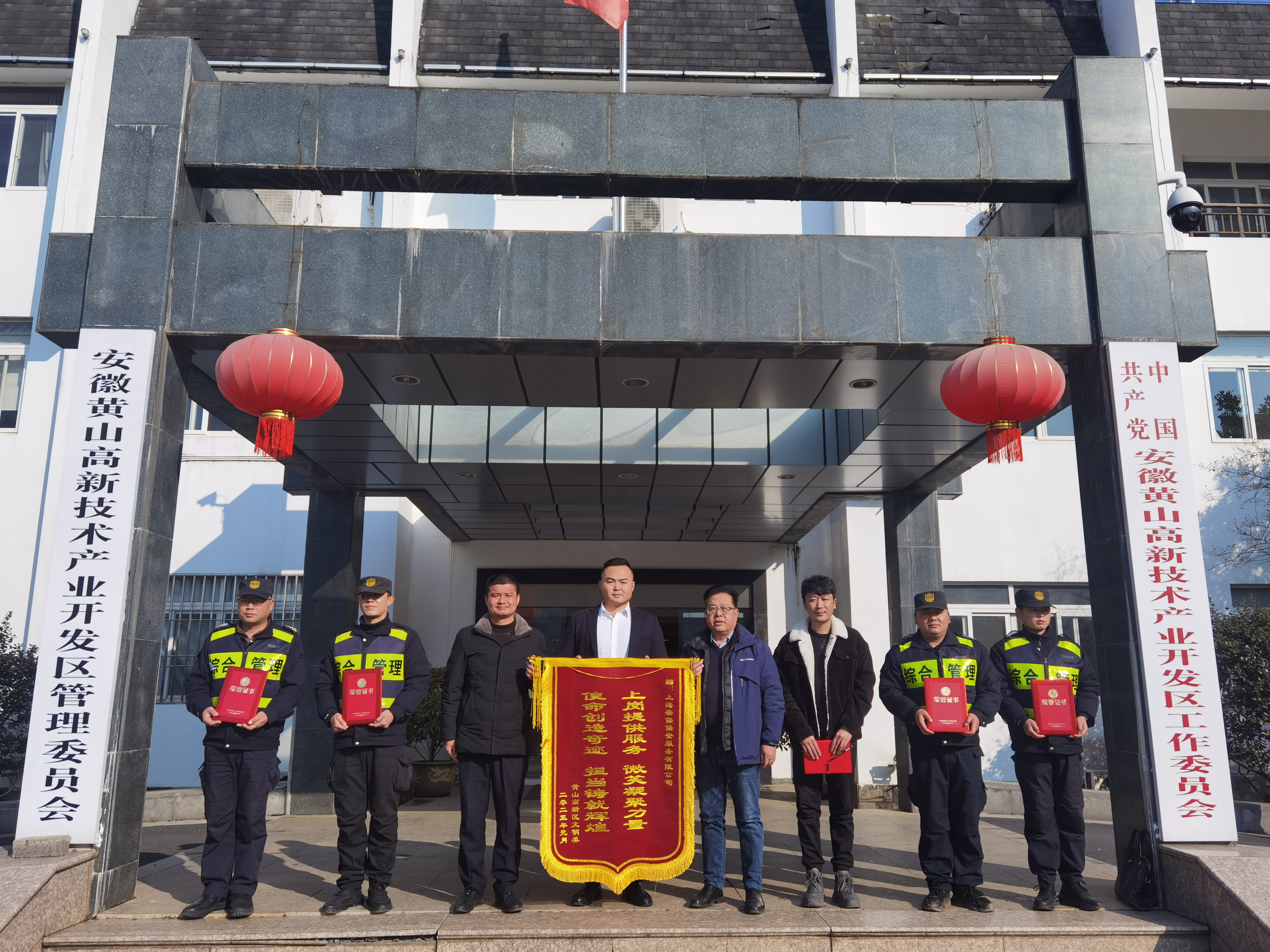 1月6日,安徽黃山市高新區管委會(huì )主任詹有成、高新區城市管理行政執法局局長(cháng)劉崗和區文明辦主任許振東為獲評黃山高新區2022年度創(chuàng )建全國文明城市先進(jìn)個(gè)人的宗保員工頒發(fā)證書(shū),贈送錦旗和慰問(wèn)金。