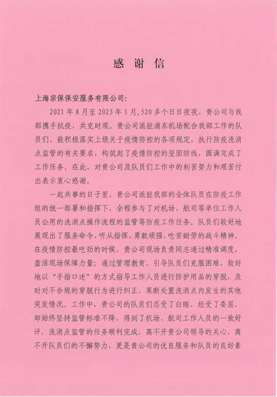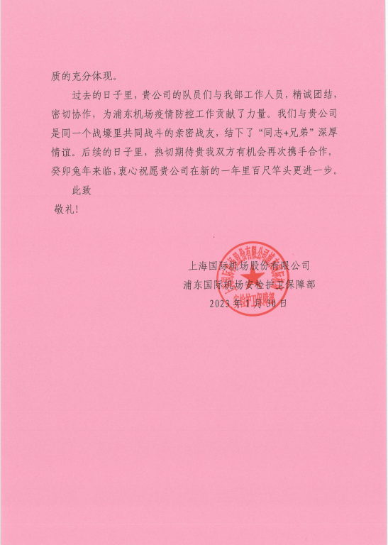 隨著(zhù)疫情防控政策的優(yōu)化調整,公司駐浦東國際機場(chǎng)疫情防控項目完成了其使命,但公司將銘記甲方的褒獎和激勵,繼續保持機場(chǎng)疫情防控中所展現出來(lái)的擔當情懷、奉獻精神和工作作風(fēng),為持續助推城市精細化管理,傳遞城市溫情,提升城市溫度,貢獻宗保力量。