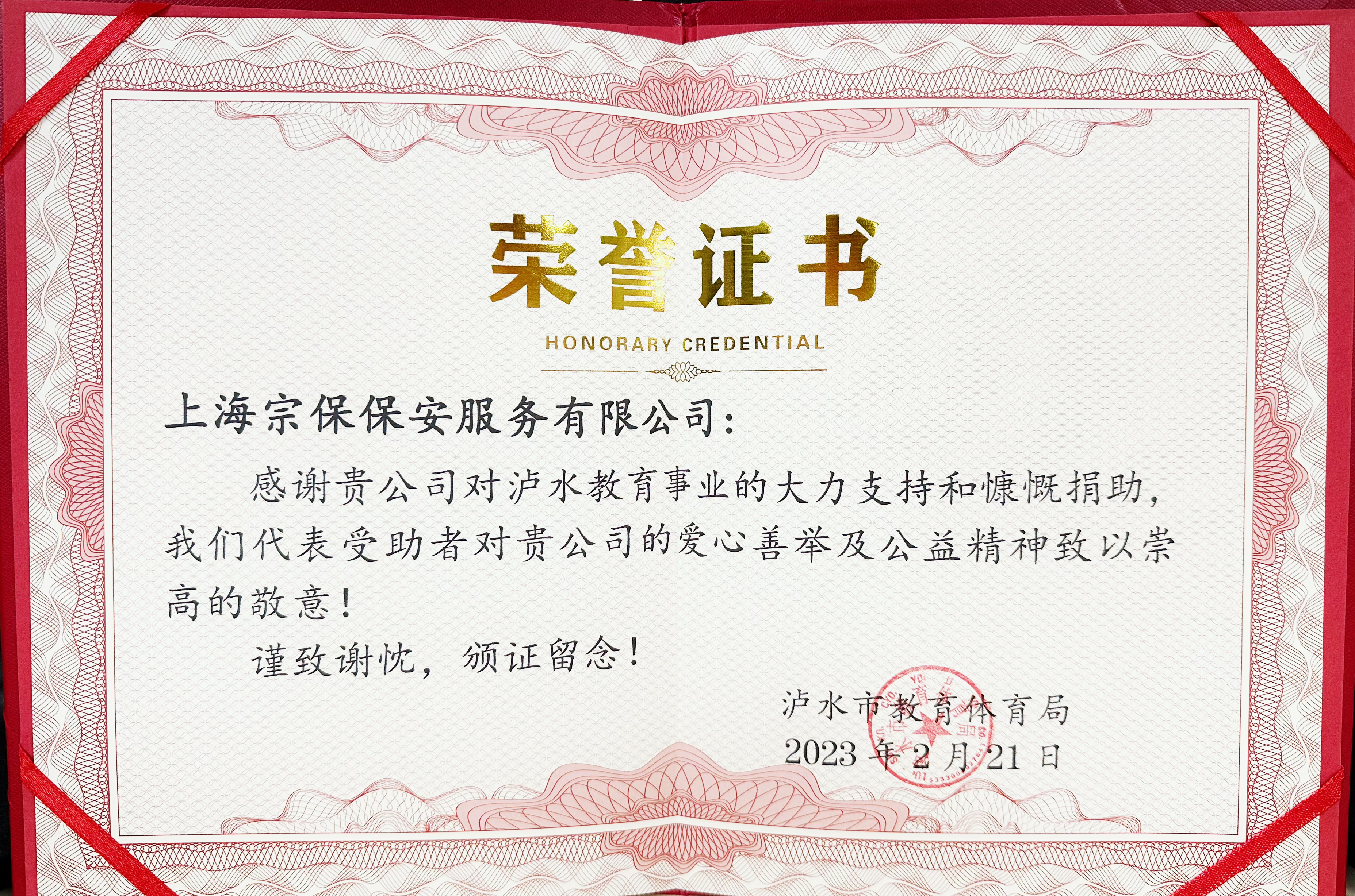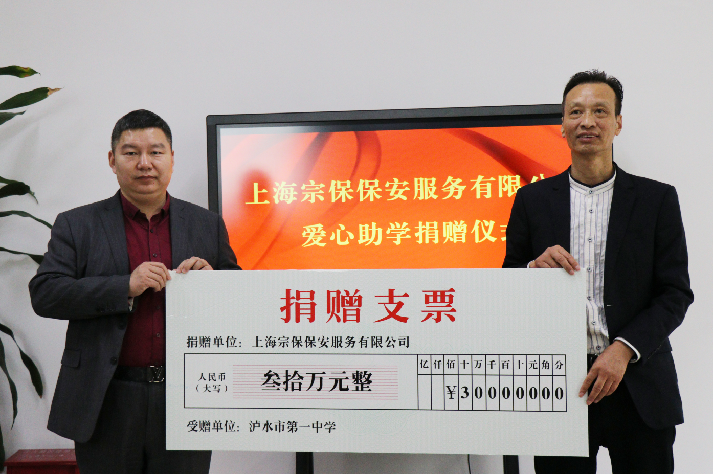 公司副總經(jīng)理楊璞一行專(zhuān)程來(lái)到瀘水市第一中學(xué)參觀(guān)學(xué)校教學(xué)建設,參加“上海宗保保安服務(wù)有限公司愛(ài)心助學(xué)捐贈儀式”,代表公司向瀘水市第一中學(xué)捐助資金30萬(wàn)元,用于幫助貧困家庭學(xué)子圓夢(mèng)學(xué)業(yè)。
