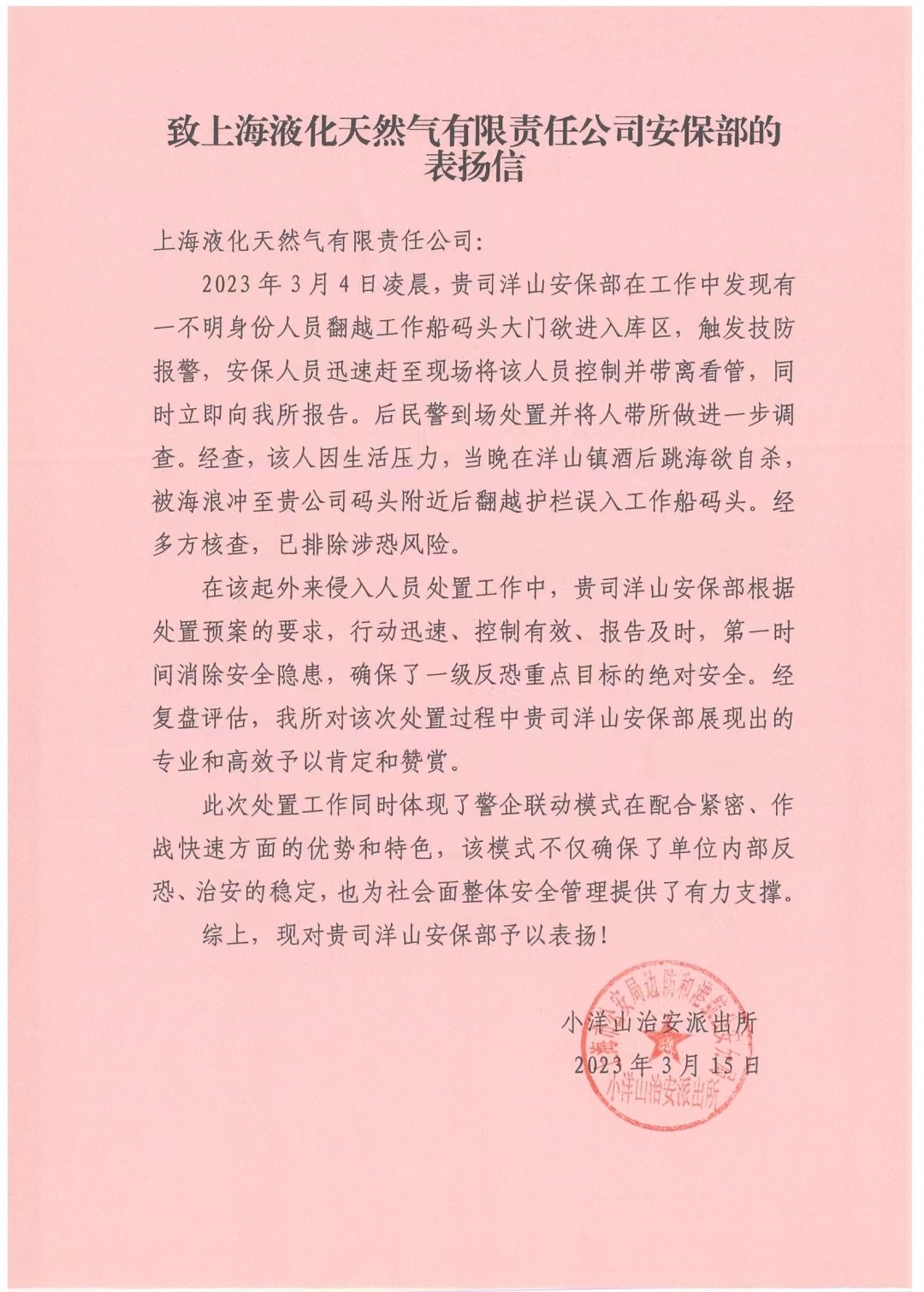3月15日,宗保公司駐洋山天然氣項目收到小洋山治安派出所的表?yè)P信,信中對公司員工出色的工作表現給予了表?yè)P。