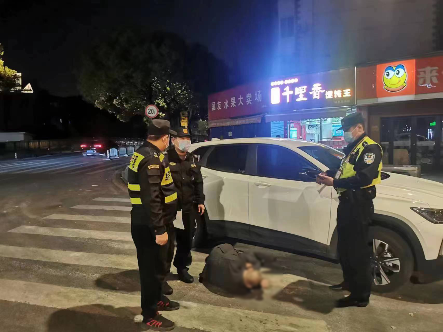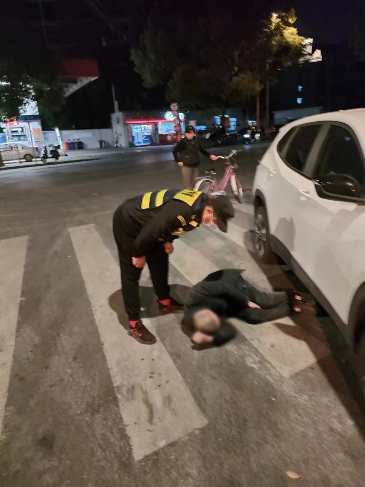 當日23:20,公司員工劉旭和胡全巡查至楊思路后長(cháng)街路口時(shí), 發(fā)現一位老人躺在一輛白色SUV車(chē)旁一動(dòng)不動(dòng)。兩人立即上前蹲下察看,老人伴有濃烈酒味,初步判斷因飲酒過(guò)量,導致昏睡不醒。