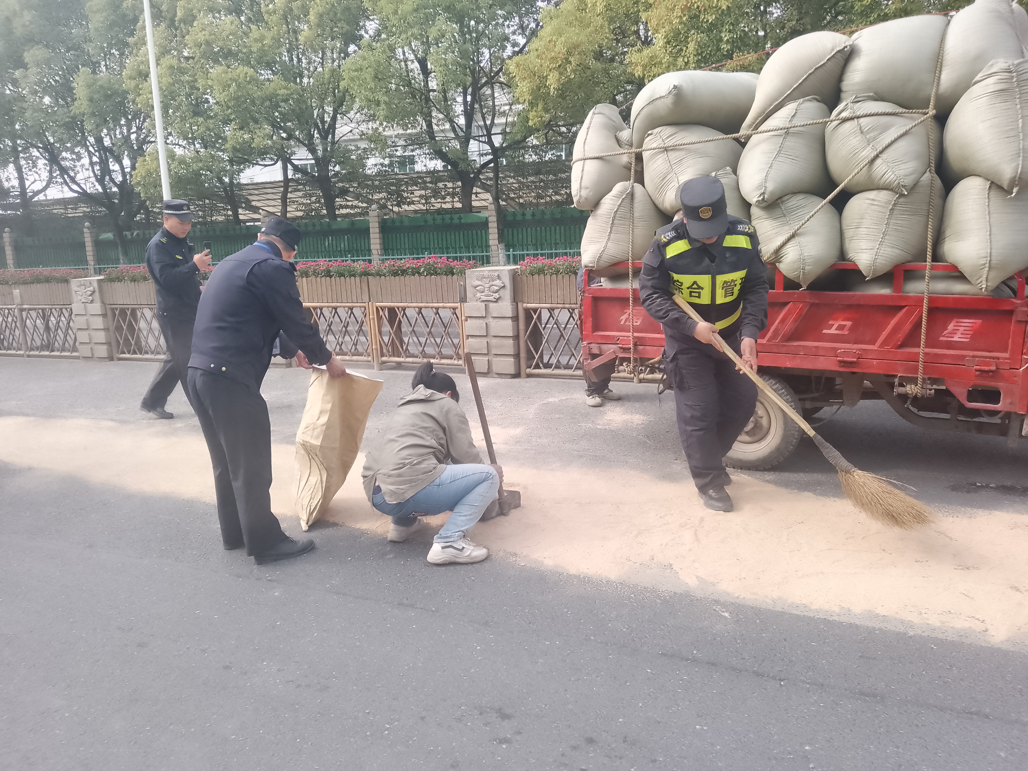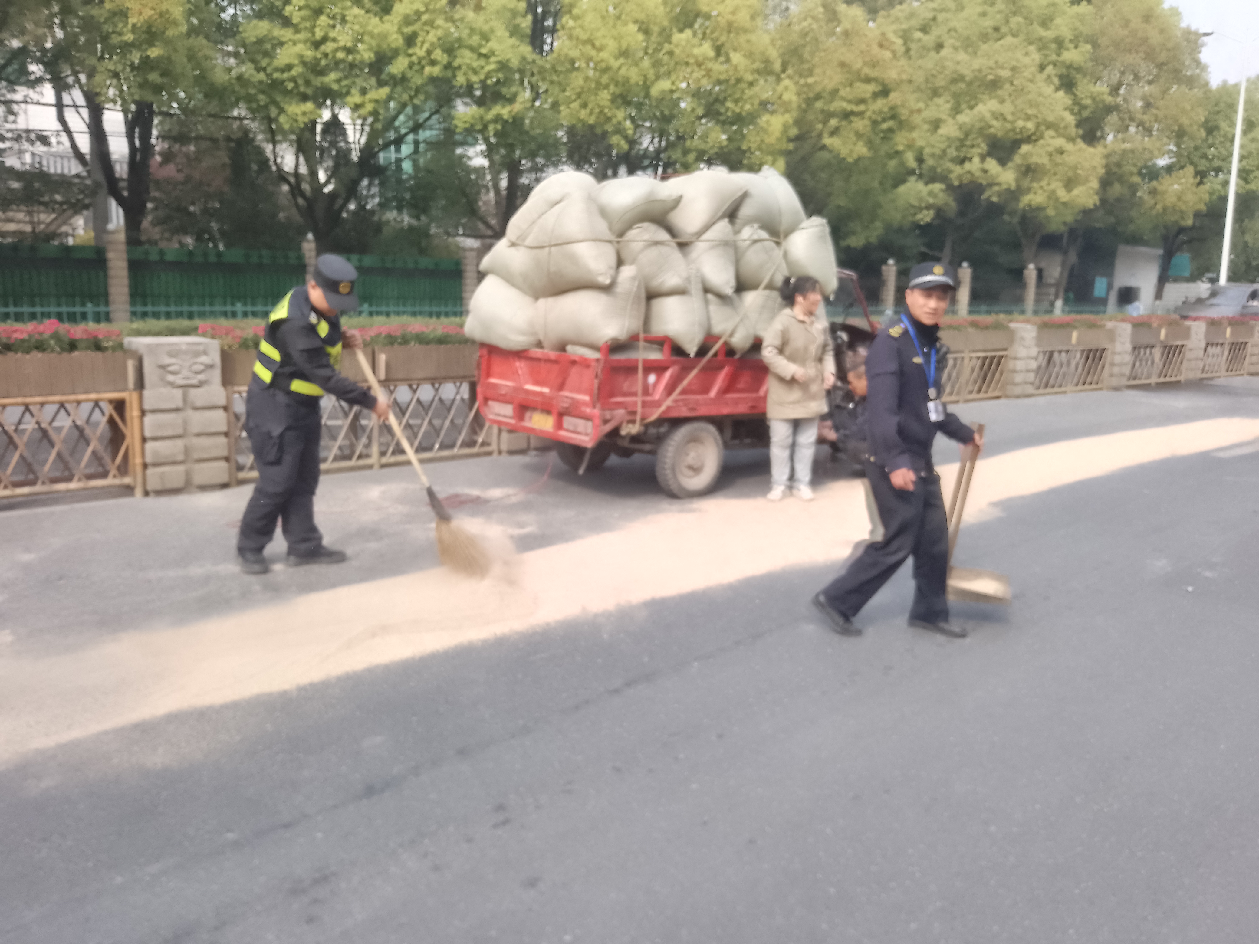 為消除安全隱患,王向華立即追上三輪車(chē)駕駛員,將其攔下告知,黃華則從附近店鋪借來(lái)掃帚清理路面散落木屑。隨后,兩人又協(xié)助三輪車(chē)駕駛員將整理好的袋子重新裝上三輪車(chē),進(jìn)行捆綁固定。