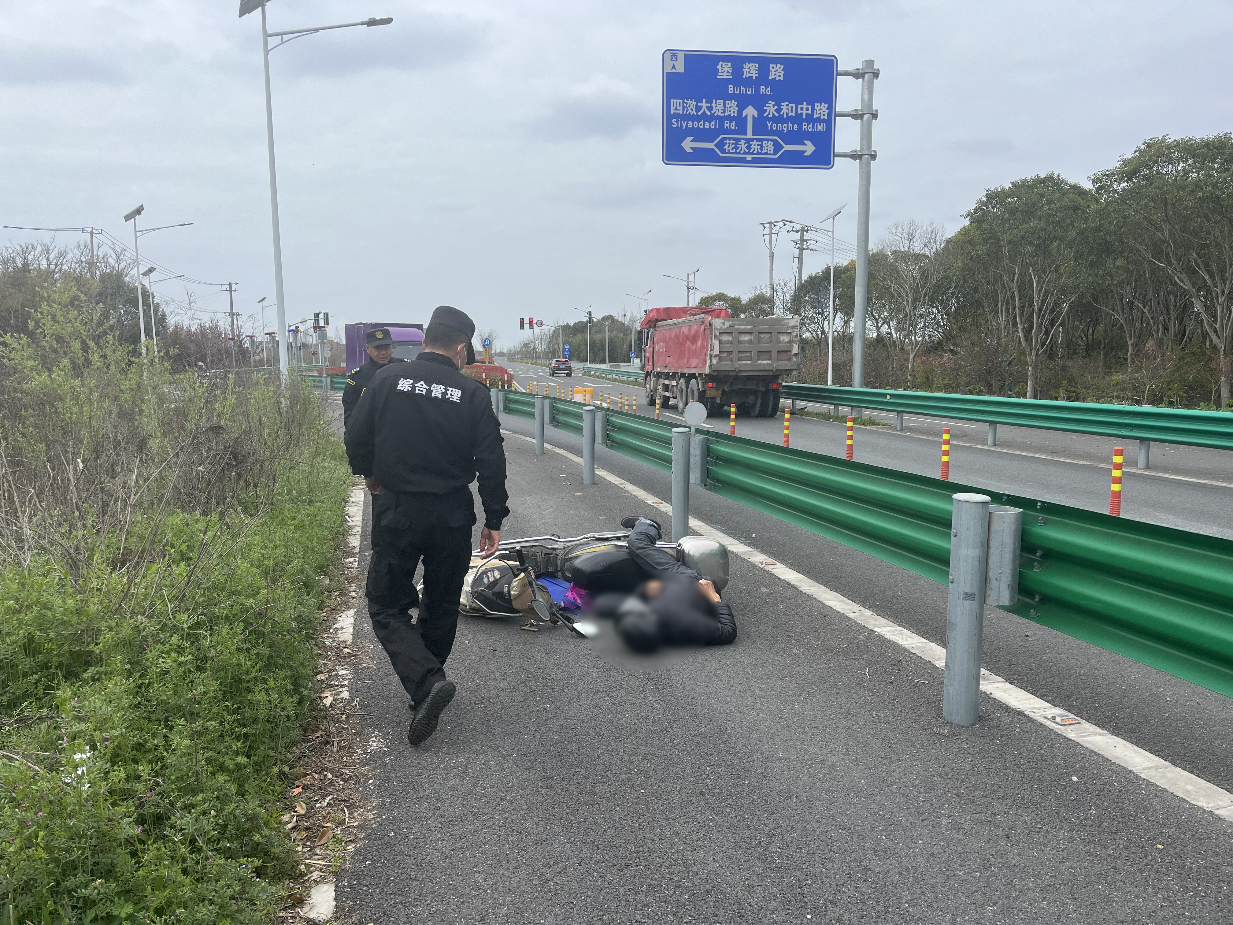 當日11:45,公司員工李祖華和姜洪權在崇明生態(tài)大道與花永東路路口巡邏時(shí),發(fā)現非機動(dòng)車(chē)道上一位老人被一輛電動(dòng)車(chē)壓在地上動(dòng)彈不得,便急忙上前幫忙。