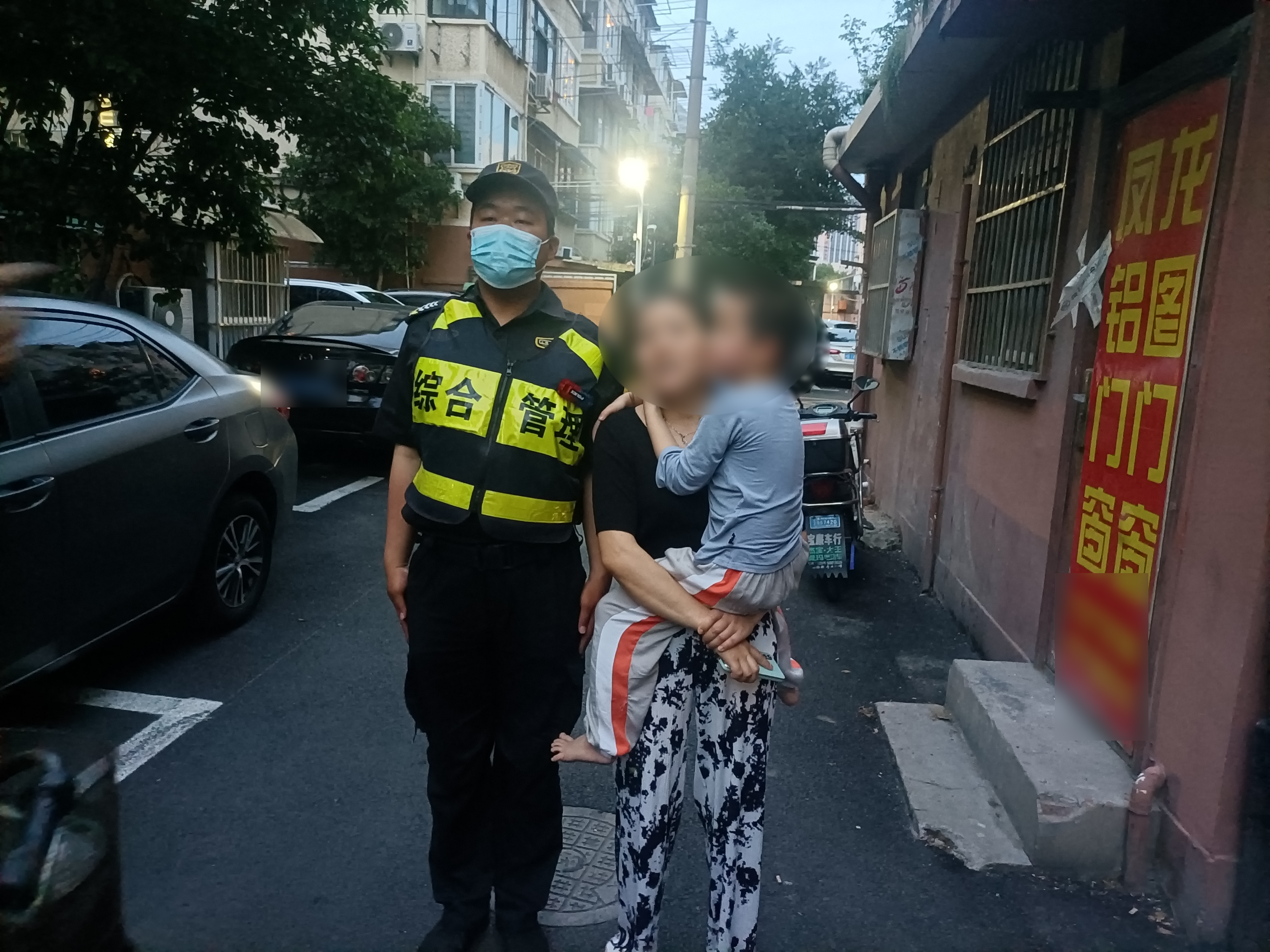 小男孩看了看身穿宗保保安制服的劉要利和李樹(shù)超,囔囔地說(shuō)住在嶗山六村,但說(shuō)不清在哪一個(gè)樓棟。劉要利抱著(zhù)男孩來(lái)到嶗山六村,邊走邊問(wèn)路人是否認識男孩。當走到某號樓時(shí),恰好碰到正在焦急尋找孩子的媽媽。
