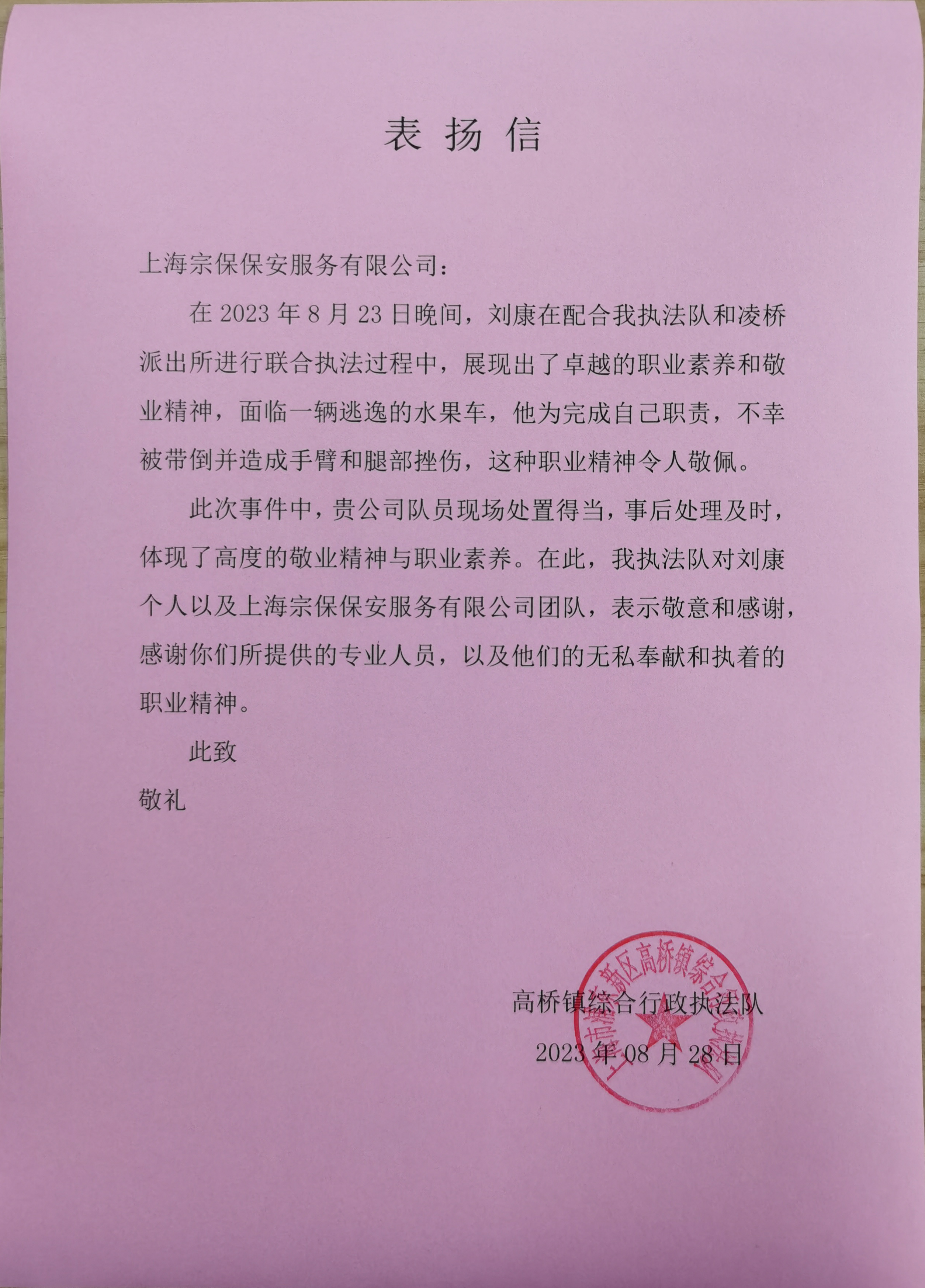 8月28日,宗保公司駐浦東新區高橋鎮城管輔助項目收到高橋鎮綜合行政執法隊的表?yè)P信,表?yè)P公司員工劉康出色的工作表現。
