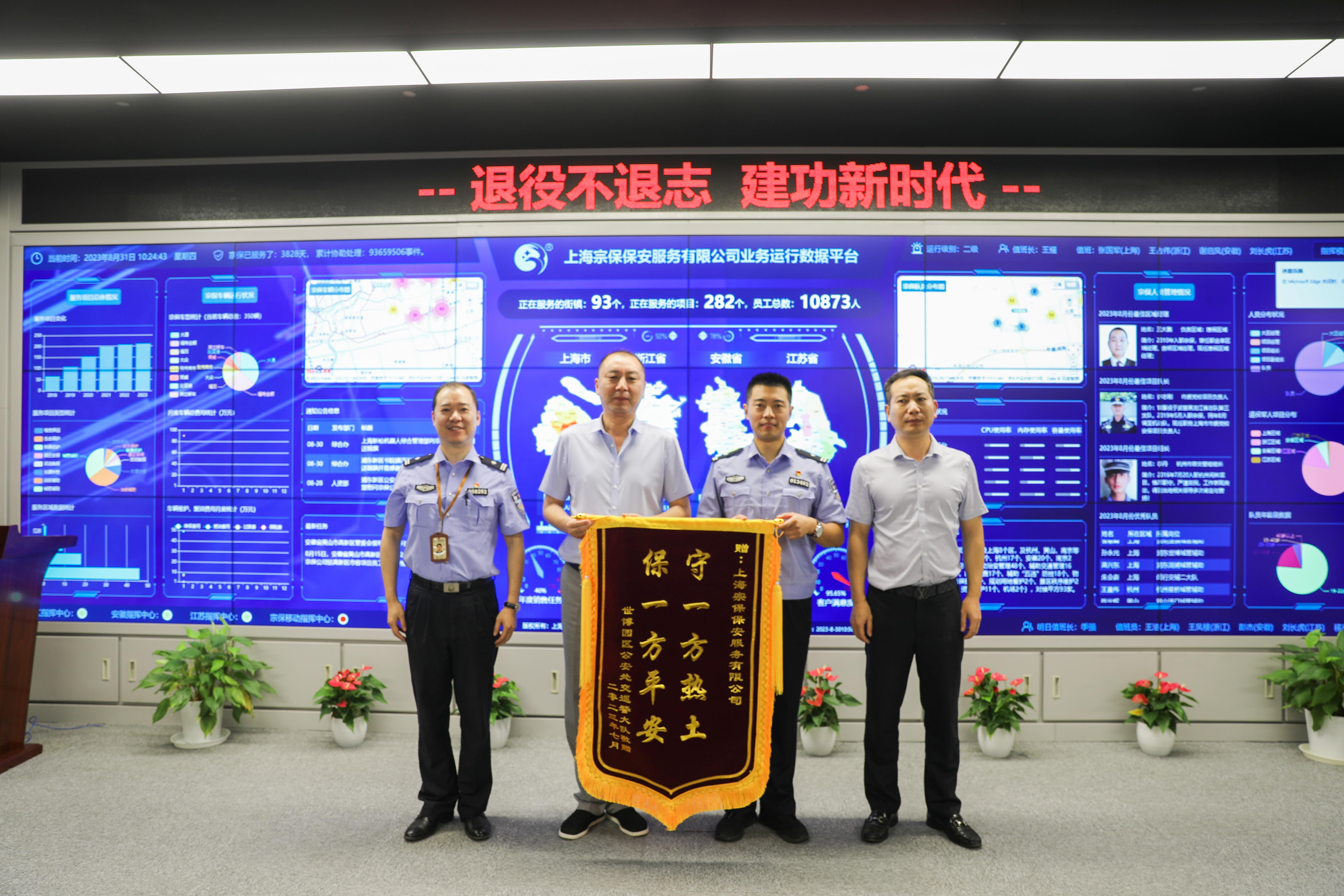 8月31日,浦東新區公安分局世博園區公安處交巡警大隊將一面繡有“守一方熱土 保一方平安”的錦旗和一封感謝信送到宗保公司董事長(cháng)王耀的手中,感謝公司對交巡警大隊工作的大力支持。