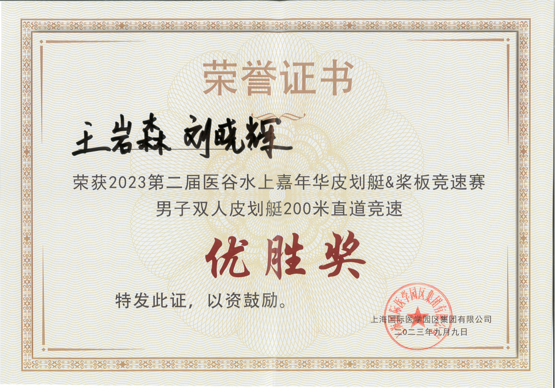 公司員工王巖森和劉曉輝榮獲2023第二屆醫谷水上嘉年華皮劃艇&槳板競速賽男子雙人皮劃艇200米直道競速優(yōu)勝獎。