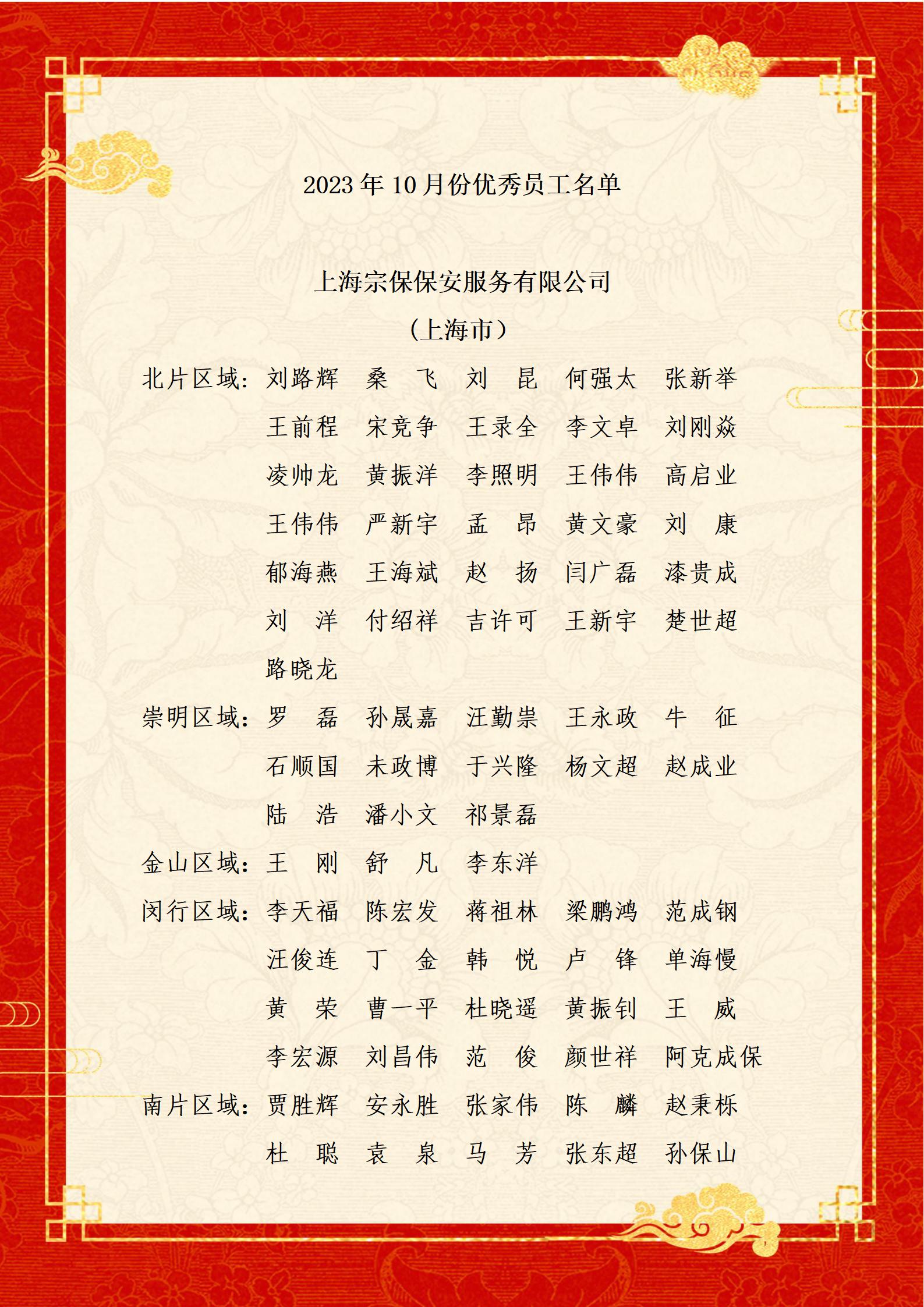 10月份,公司廣大員工根據甲方的任務(wù)要求,按照公司的部署安排,持續發(fā)揚勇于擔當、積極作為的工作作風(fēng),助力完成了杭州第19屆亞洲運動(dòng)會(huì )、杭州第四屆亞洲殘疾人運動(dòng)會(huì )、2023年環(huán)崇明島國際自盟女子公路世界巡回賽等大型活動(dòng)安保任務(wù),協(xié)助做好了中秋國慶雙節等安保工作,配合甲方做好了城市管理輔助、治安巡邏聯(lián)防、物業(yè)服務(wù)保障、生態(tài)環(huán)境保護、高鐵線(xiàn)路巡防等工作。期間,涌現出了一批盡心履責、崗位建功、拾金不昧、熱心助人的優(yōu)秀員工和先進(jìn)典型。