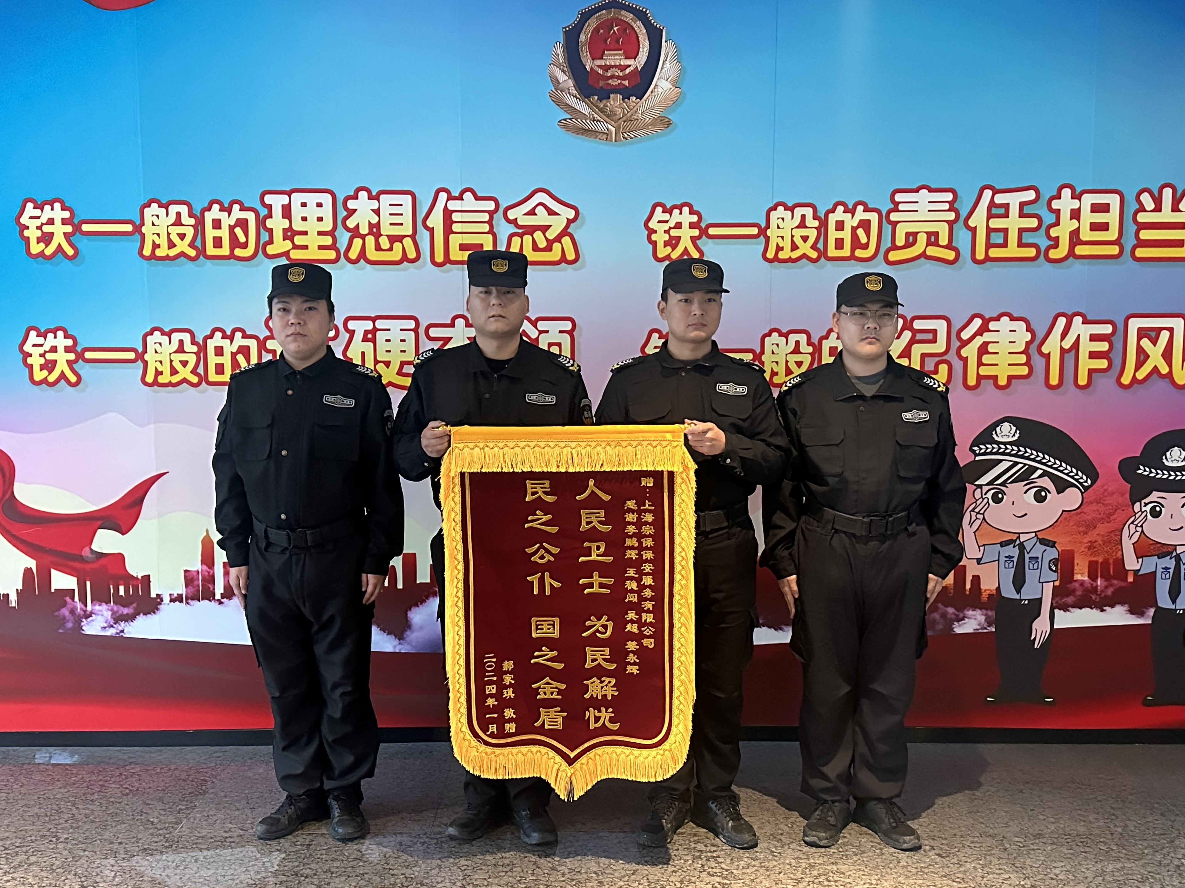 1月29日,宗保公司駐浦東新區公安分局臨港新城派出所輔助項目收到市民郝女士送來(lái)的一面繡有“人民衛士 為民解憂(yōu) 民之公仆 國之金盾”的錦旗,感謝公司員工幫其找回鉆戒的助人行為。