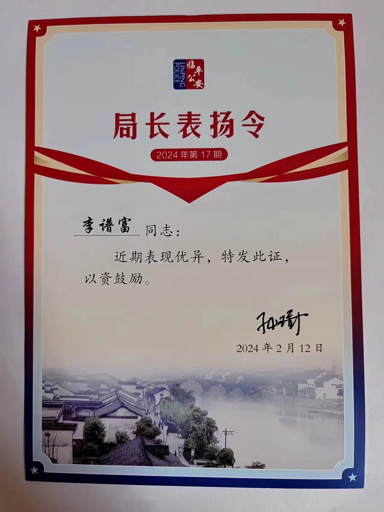 2月8日,浙江民泰駐杭州市臨平區南苑派出所輔助項目收到臨平區公安分局孫琦局長(cháng)簽發(fā)的17號《局長(cháng)表?yè)P令》,對公司員工李譜富協(xié)助抓獲盜竊嫌疑人的出色表現給予表?yè)P。