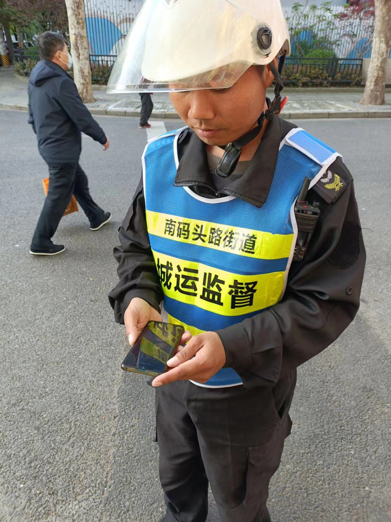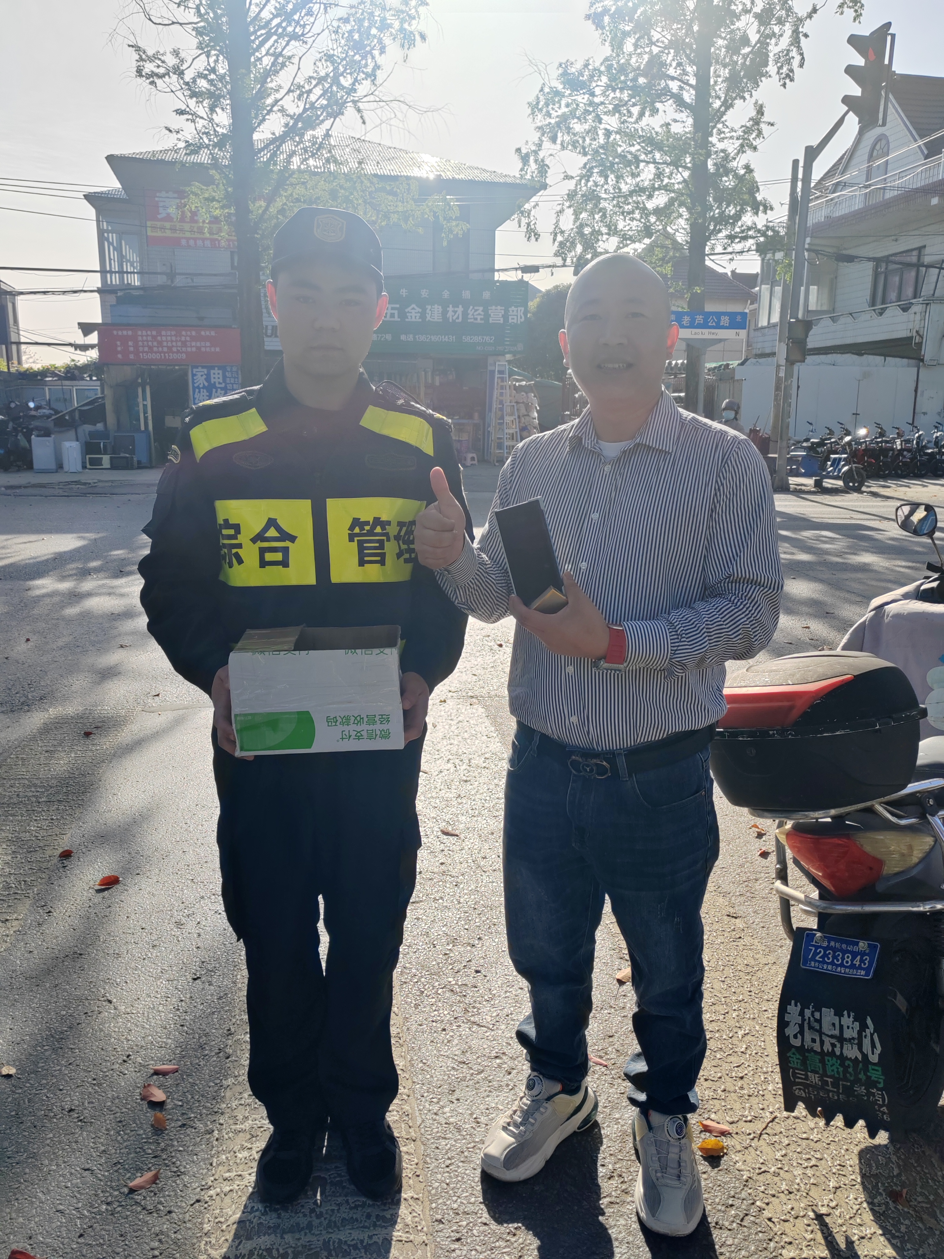 4月2日11:45,宗保公司駐浦東新區南碼頭城運網(wǎng)格項目員工陳安生巡查至高科西路齊恒路路口時(shí),撿到一部華為手機,報告組長(cháng)后便在原地邊巡查邊等待失主。約過(guò)了1個(gè)小時(shí),一位說(shuō)話(huà)遲緩、自稱(chēng)是失主的男子打來(lái)電話(huà)。陳安生聽(tīng)其口氣,像是一位老人,了解情況后就與老人約定碰面地點(diǎn),但老人表示自己不熟悉路,怕找不到地方。得知這一情況,陳安生主動(dòng)提出將手機送過(guò)來(lái),隨即就根據老人提供的位置信息,找到了等在小區門(mén)口的老人,并把手機交還給了他。老人拿到手機十分高興,掏出100現金要塞給陳安生表示感謝,被陳安生婉言謝絕了。老人見(jiàn)陳安生執意不收,連連贊揚道謝。