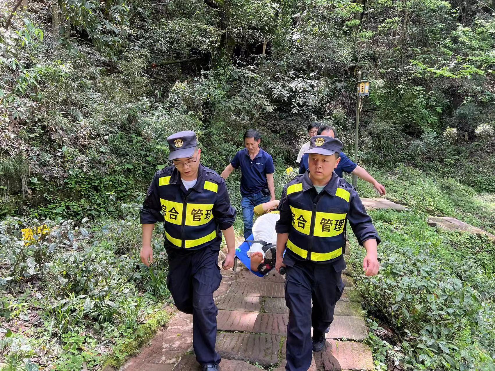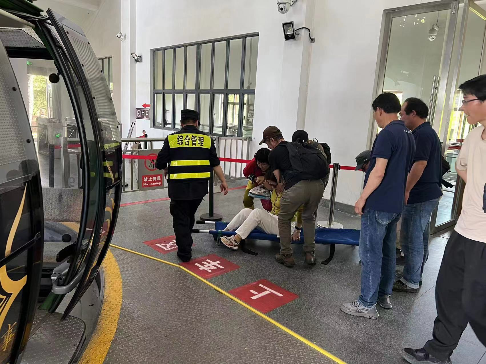 不一會(huì )兒,幾人來(lái)到女士所處位置。經(jīng)溝通得知,女士右腳崴傷,疼痛無(wú)法站立行走。為了確保安全,幾人將女士抬上擔架,并用安全帶捆扎固定,隨后合力將其抬到景區索道站,移交給醫護人員進(jìn)行救治。