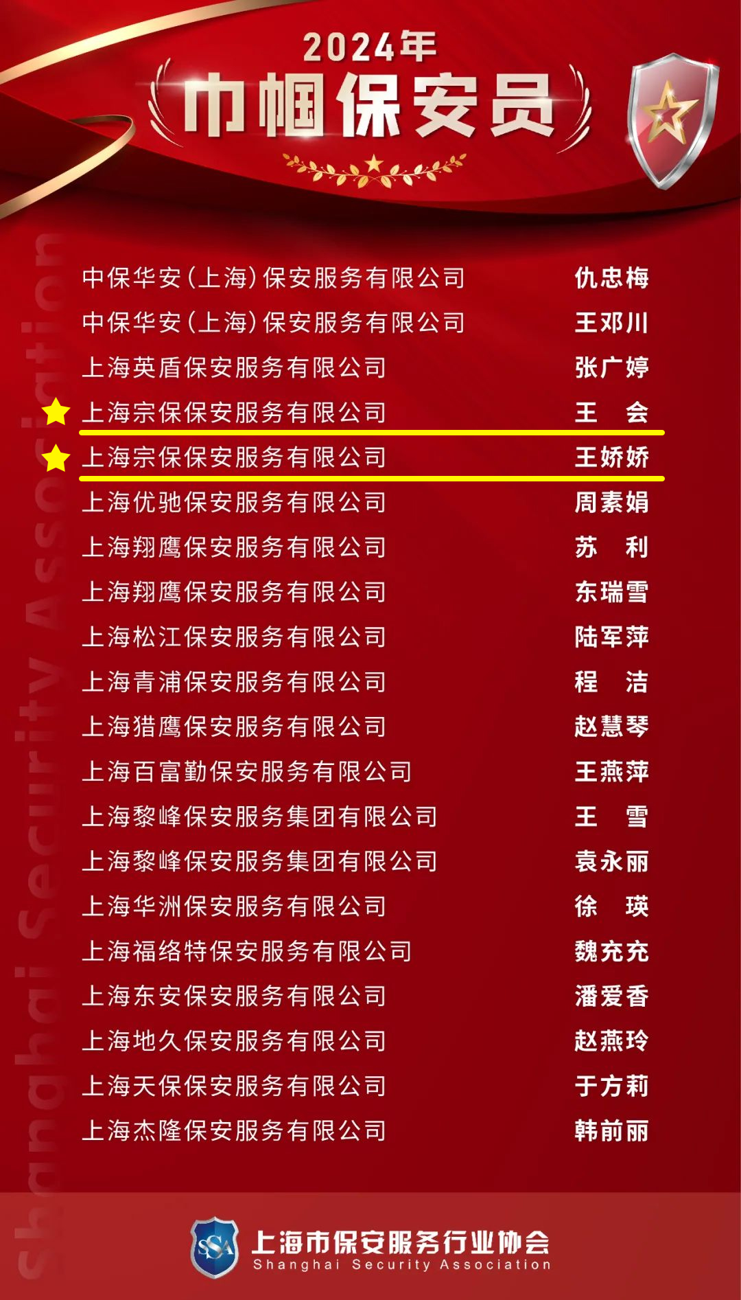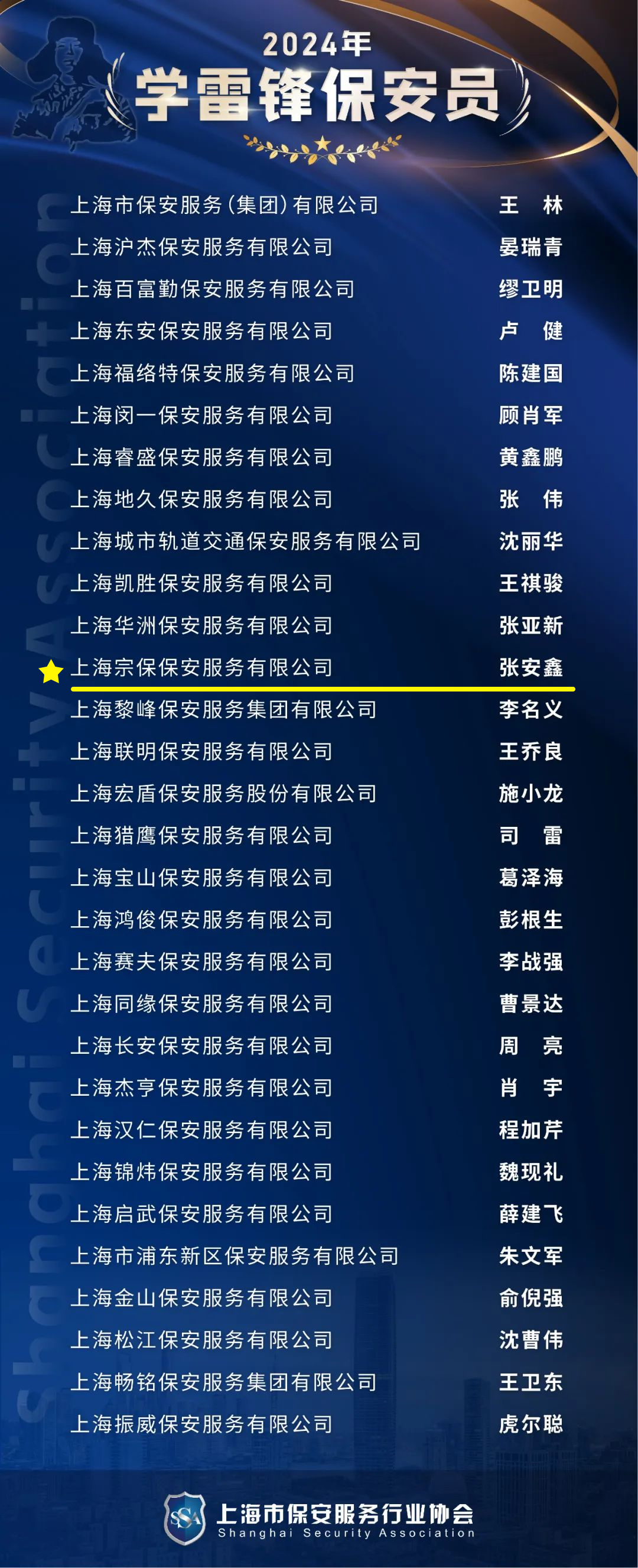 近日,上海市保安服務(wù)行業(yè)協(xié)會(huì )公布了“學(xué)雷鋒保安隊”“學(xué)雷鋒保安員”“巾幗保安員”評選結果,宗保公司1個(gè)項目隊和3名員工分獲殊榮。