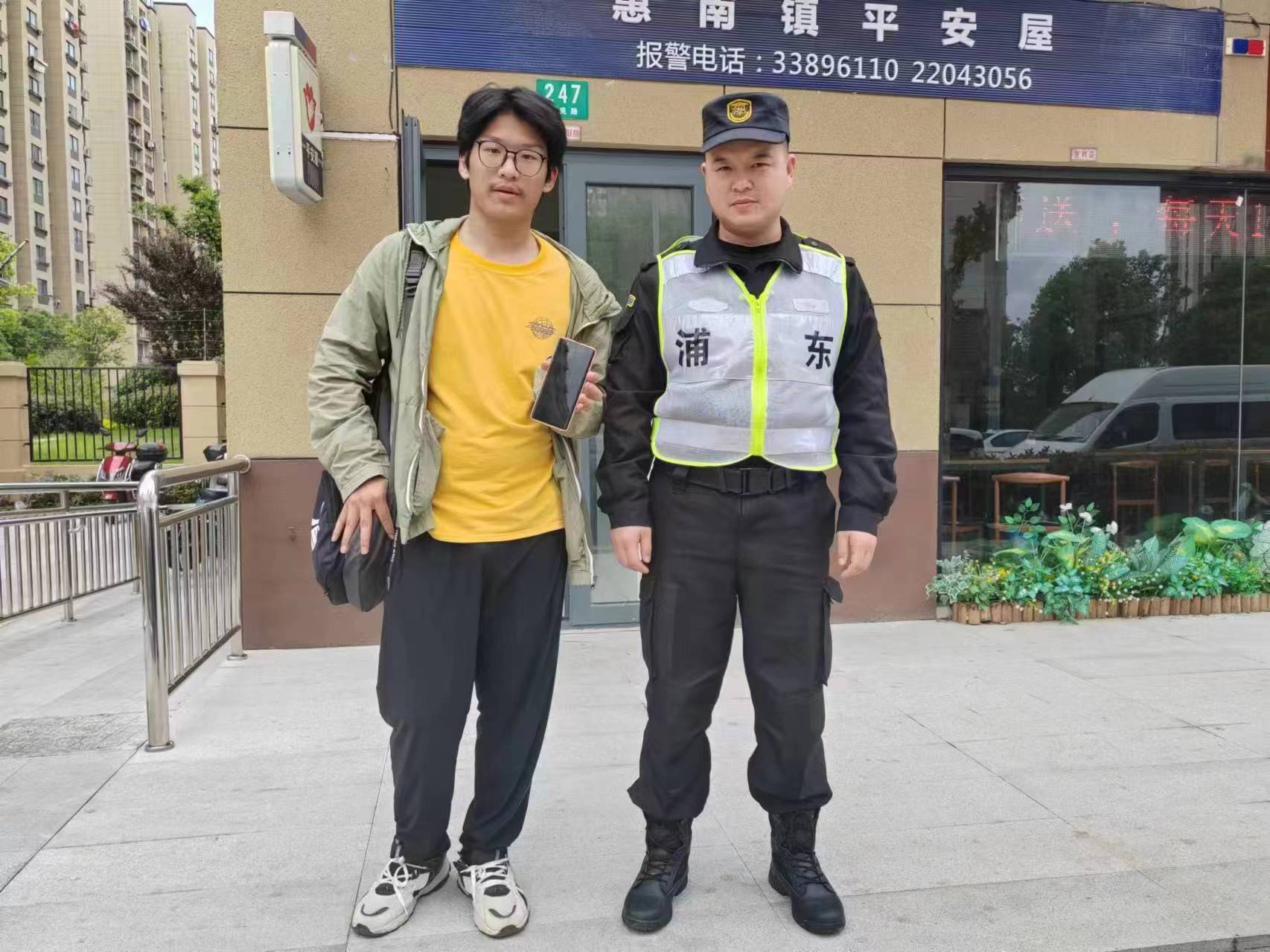 5月2日13:35,宗保公司駐浦東新區惠南鎮民樂(lè )派出所輔助項目員工徐公源和吳志超在聽(tīng)達路拱優(yōu)路西側巡邏時(shí),撿到一部vivo手機,報告組長(cháng)后便在原地邊執勤邊等待失主。大概過(guò)了十幾分鐘,一位自稱(chēng)是失主的男子打來(lái)電話(huà),徐公源了解情況后便與他約好碰面地點(diǎn)。不一會(huì ),一位年輕小伙來(lái)到約定地點(diǎn)。吳志超核對確認其是失主后,就把手機交還給了他。小伙拿著(zhù)手機非常高興,激動(dòng)地連連向宗保員工致謝。