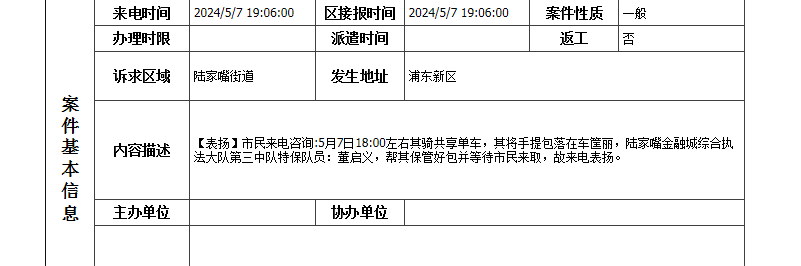 5月7日18:30,公司員工董啟義在地鐵9號線(xiàn)商城路站2號口附近巡查時(shí),在一輛共享單車(chē)的車(chē)筐里發(fā)現一個(gè)手提包,報告班組長(cháng)后便在原地等待。10分鐘后,一女士前來(lái)尋找。董啟義通過(guò)核對手提包里身份證等信息,確認女士是失主后,就把手提包交還給了她。女士很高興連連道謝,還特意撥打了上海市民服務(wù)熱線(xiàn)12345表?yè)P董啟義。