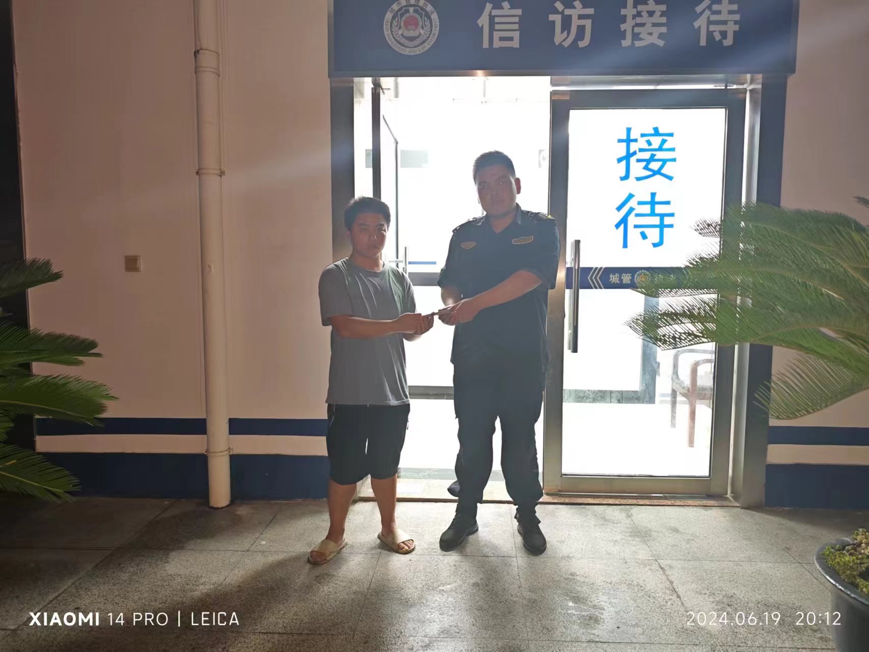 后來(lái),一男子打電話(huà)尋找手機,城管執法中隊值班人員告訴其前往中隊信訪(fǎng)窗口取手機。男子很快趕到周浦鎮城管執法中隊,值班人員確認其是失主后,就將手機交還給了他。男子接過(guò)手機,當得知是宗保公司員工撿到手機上交后,一再請值班人員代向公司員工道謝。