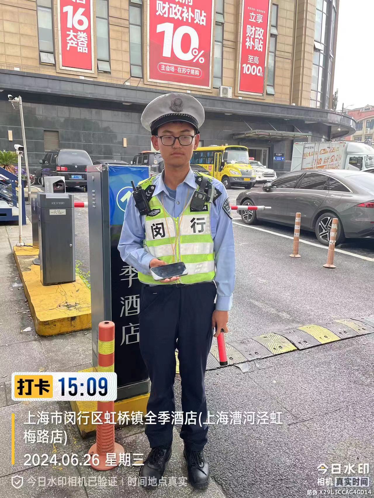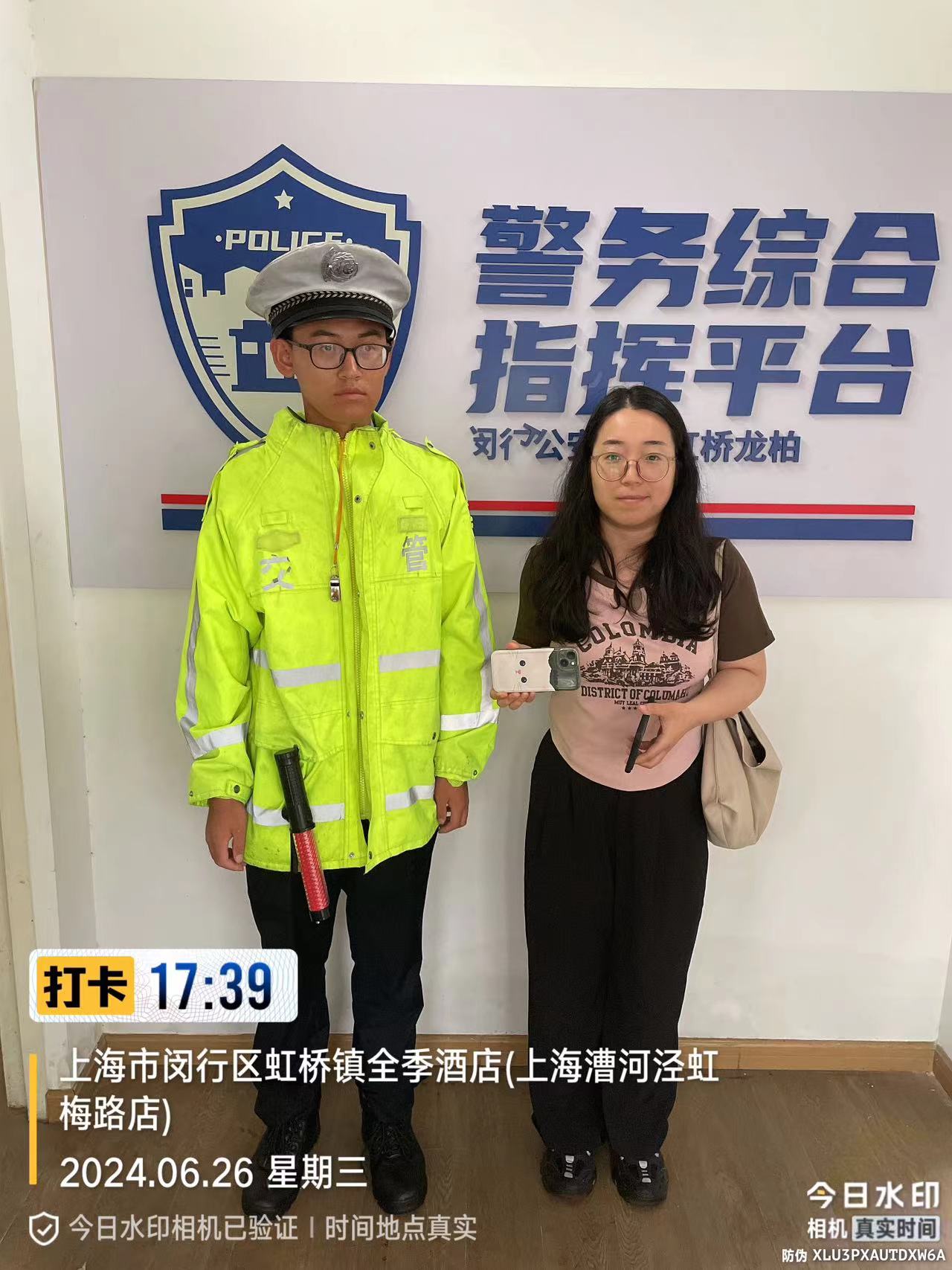 6月26日15:09,宗保公司駐閔行區虹橋交管輔助項目員工李業(yè)兵在吳中路虹許路路口執勤時(shí),撿到一部蘋(píng)果手機,詢(xún)問(wèn)周?chē)啡藷o(wú)人認領(lǐng)后,將情況報告了項目隊長(cháng)。過(guò)了一會(huì )兒,一位女士打來(lái)電話(huà)尋找手機,李業(yè)兵問(wèn)了問(wèn)情況,便與她約好在交警崗亭碰面。17:39,一位身穿短T的女士來(lái)到交通崗亭。李業(yè)兵核實(shí)確認女士是失主后,就把手機交還給了她。女士拿著(zhù)手機十分高興,連連向李業(yè)兵道謝。