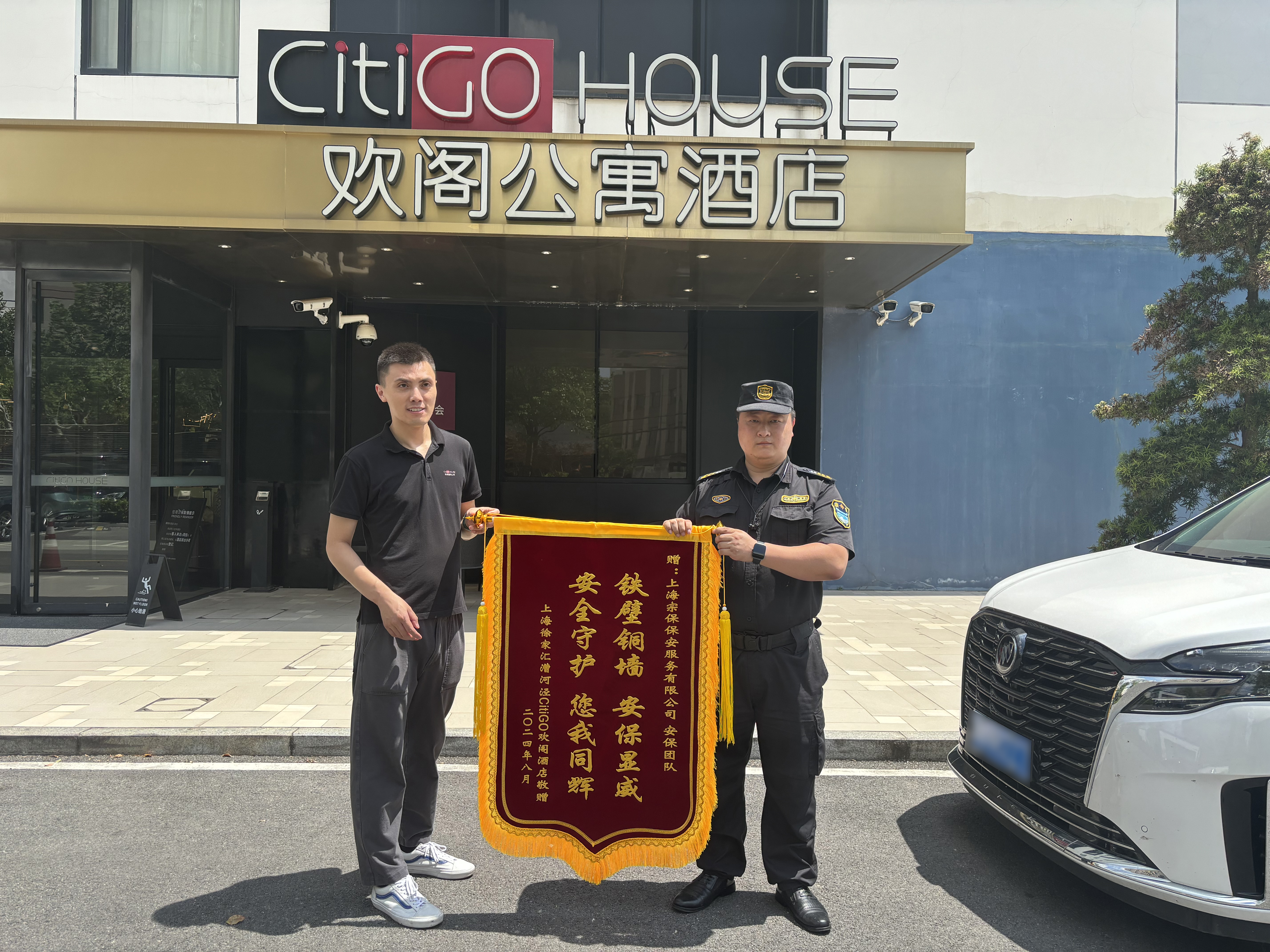 8月14日,宗保公司駐徐匯區歡閣公寓酒店項目收到上海徐家匯漕河涇CitiGO歡閣酒店贈送的繡有“鐵壁銅墻 安保顯威 安全守護您我同輝”的錦旗,贊揚公司項目員工警惕勇為的出色表現。