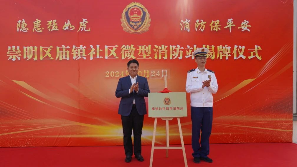10月24日上午,崇明區廟鎮社區微型消防站舉行揭牌儀式,宗保公司作為配合建設單位參加揭牌儀式。廟鎮黨委書(shū)記陳建飛、崇明區消防支隊支隊長(cháng)車(chē)斌共同為消防站揭牌。