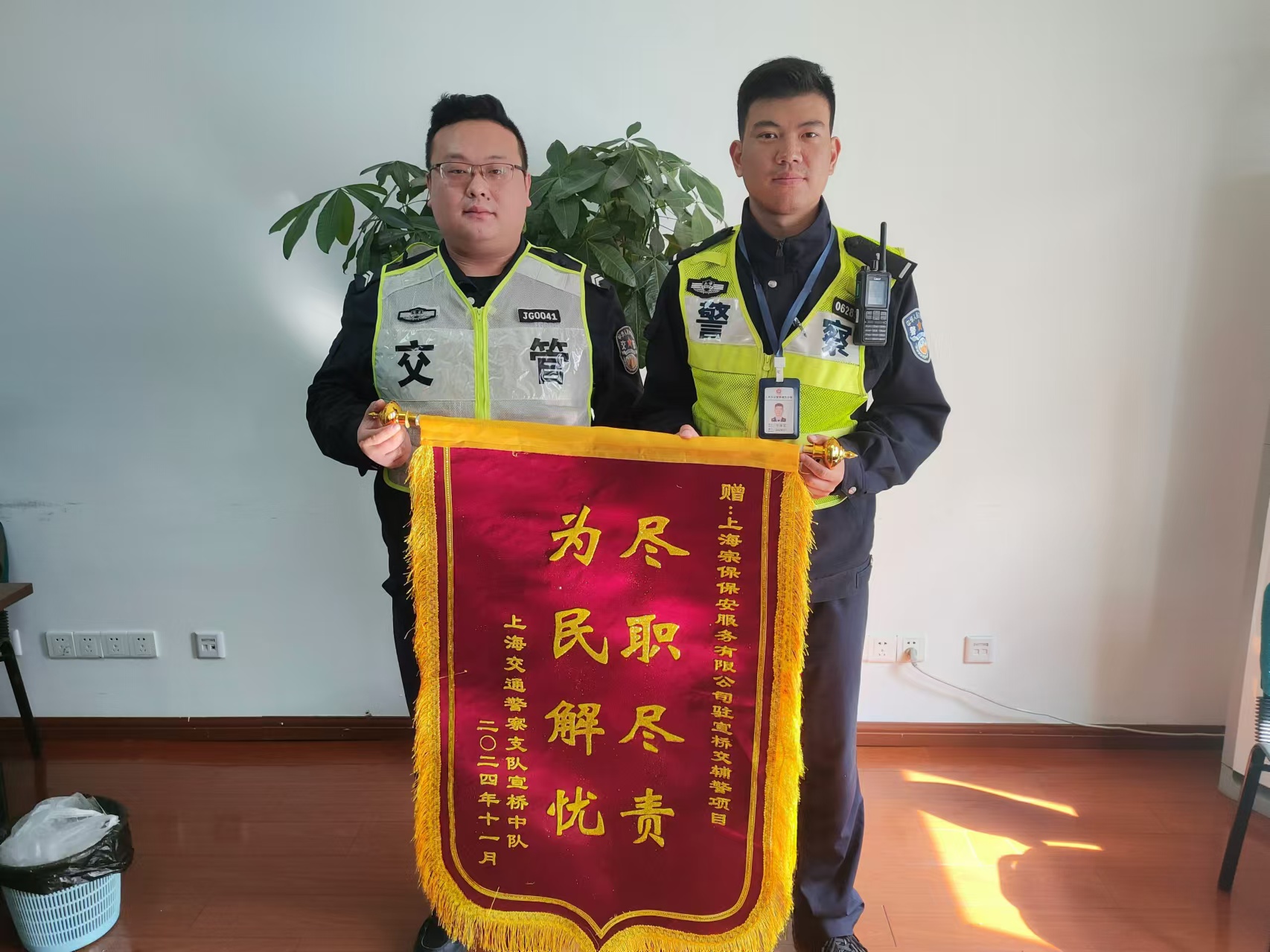 11月5日,宗保公司駐浦東新區宣橋交管輔助項目收到上海交通警察支隊宣橋中隊贈送的一面繡有“盡職盡責 為民解憂(yōu)”的錦旗,表?yè)P公司員工出色的工作表現。