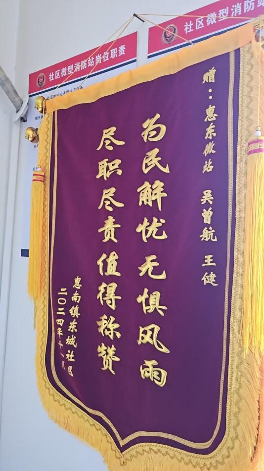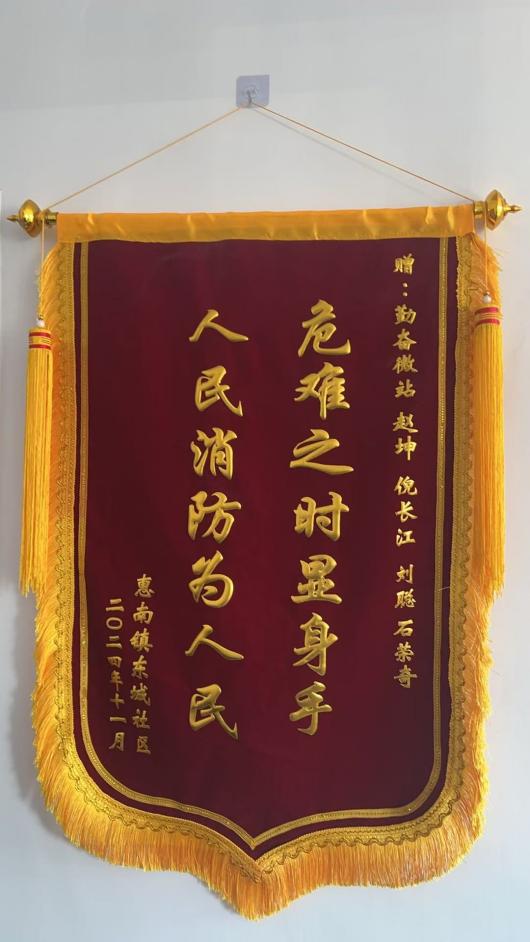 浦東新區惠南鎮惠園微站獲贈繡有“危難之時(shí)顯身手 人民消防為人民”的錦旗、徐廟微站獲贈繡有“無(wú)私救援獻愛(ài)心 危急時(shí)刻顯身手”的錦旗、惠城微站獲贈繡有“為民解憂(yōu) 無(wú)懼風(fēng)雨 盡職盡責 值得稱(chēng)贊”的錦旗