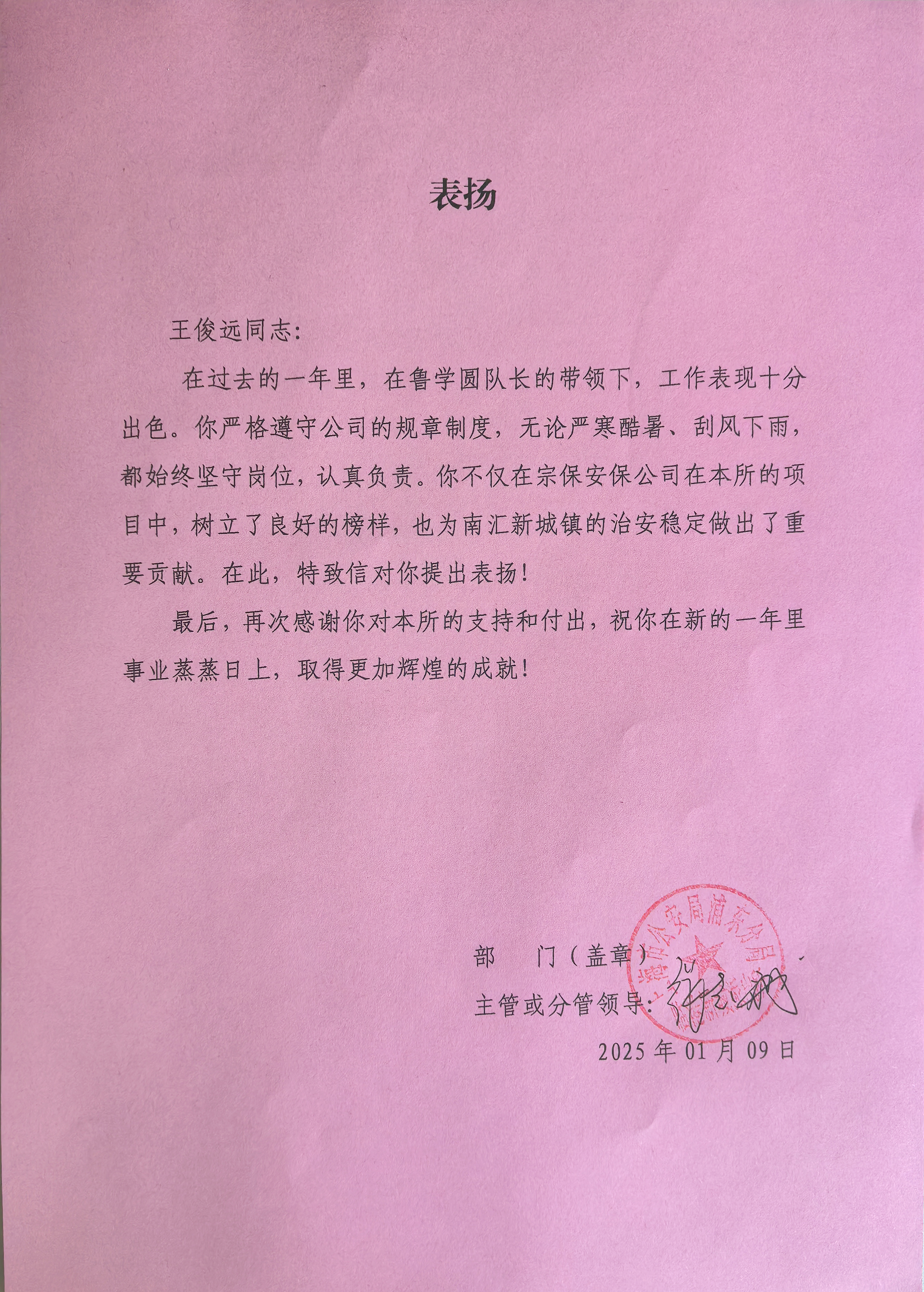 1月10日,宗保公司收到浦東新區公安分局臨港新城派出所3封表?yè)P信,感謝公司對臨港新城派出所工作的大力支持和全力配合,贊揚公司員工李鵬輝和王俊遠工作中認真負責、嚴謹細致的突出表現。