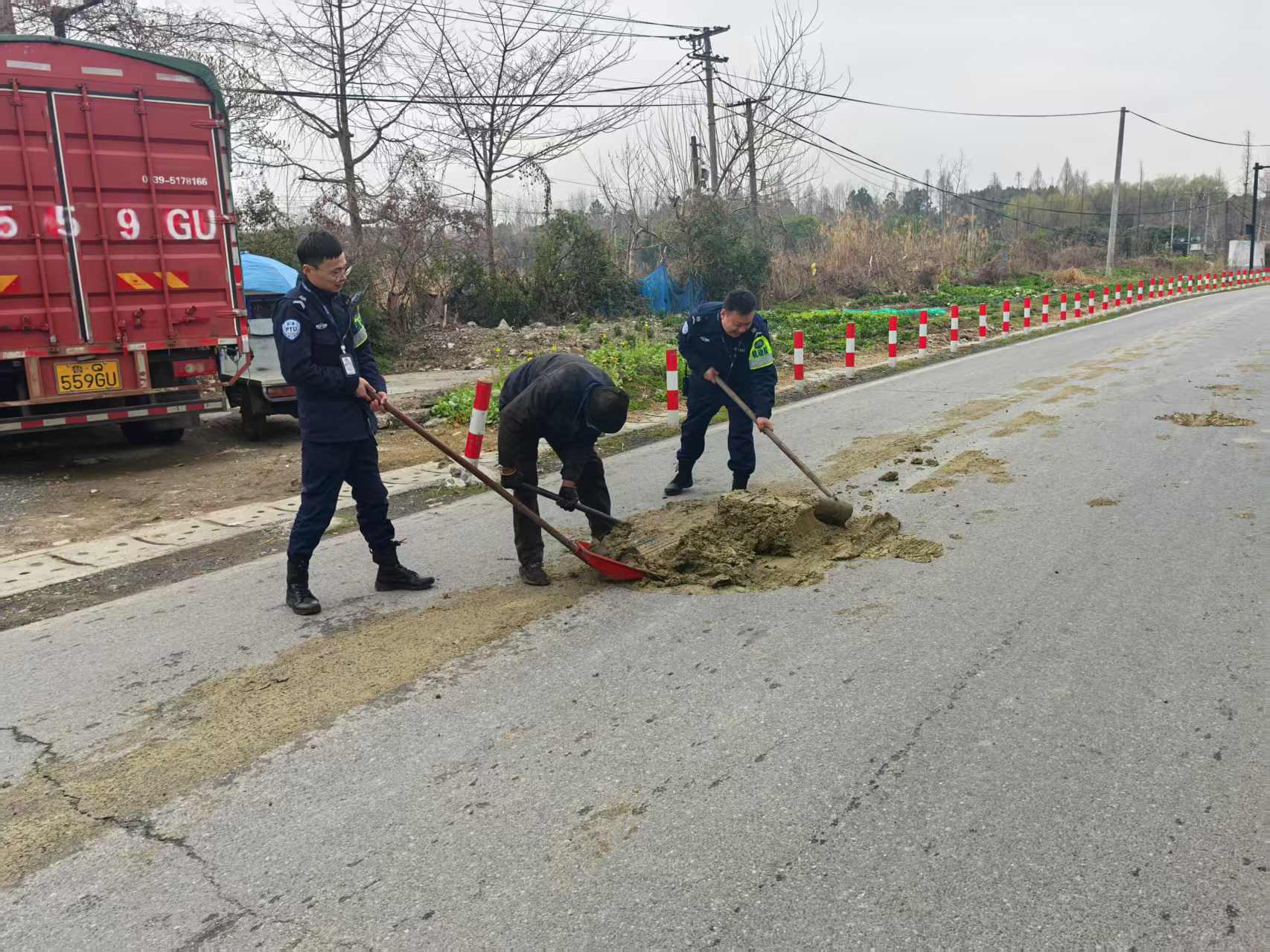 3月5日,浙江民泰公司駐杭州市余杭區良渚新城派出所輔助項目員工齊心協(xié)力清理路面散落黏土,保障道路通行安全。