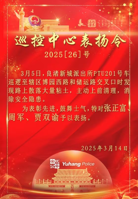 事后,為了表彰每位參與者身上所展現出來(lái)的正能量,余杭區公安分局巡控中心特意向參與此次清理工作的民泰公司駐杭州市余杭區良渚新城派出所輔助項目的員工賈雙諭、巡車(chē)長(cháng)張正富以及勤務(wù)隊員周軍發(fā)出了通報表?yè)P。他們的行為充分體現了作為社會(huì )成員應有的責任感和使命感,也為構建和諧社區貢獻了自己的力量。