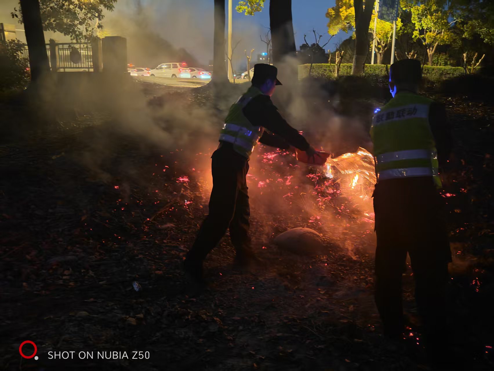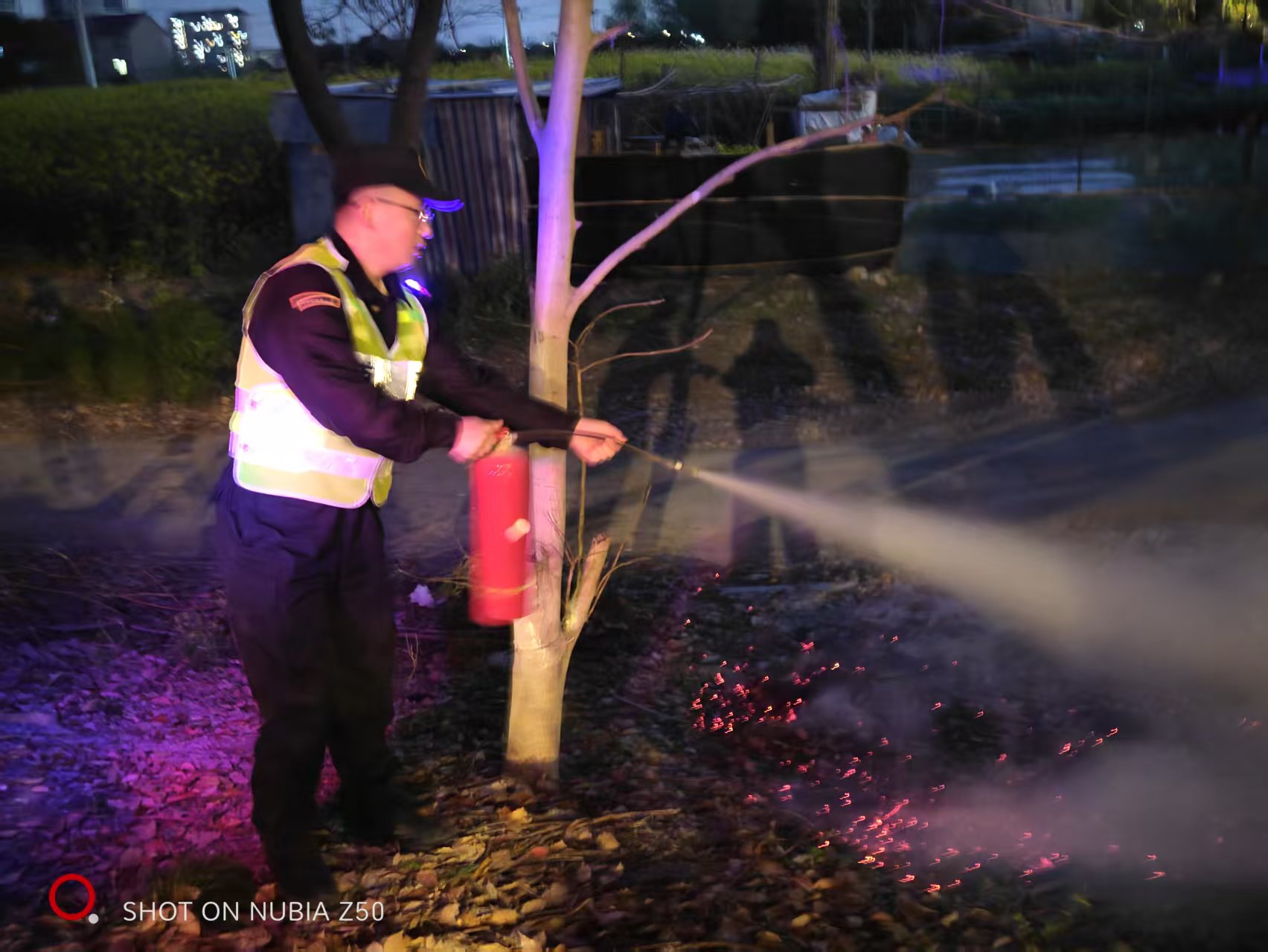 當晚19:00,景鵬鑫和李博文巡邏至周祝公路康新公路路口時(shí),發(fā)現南側綠化帶內的樹(shù)葉起火。面對突發(fā)火情,兩人迅速反應,分工協(xié)作:李博文就地取材,利用周邊物品控制火勢蔓延;景鵬鑫則立即返回派出所取用滅火器,并迅速返回現場(chǎng)投入撲救。