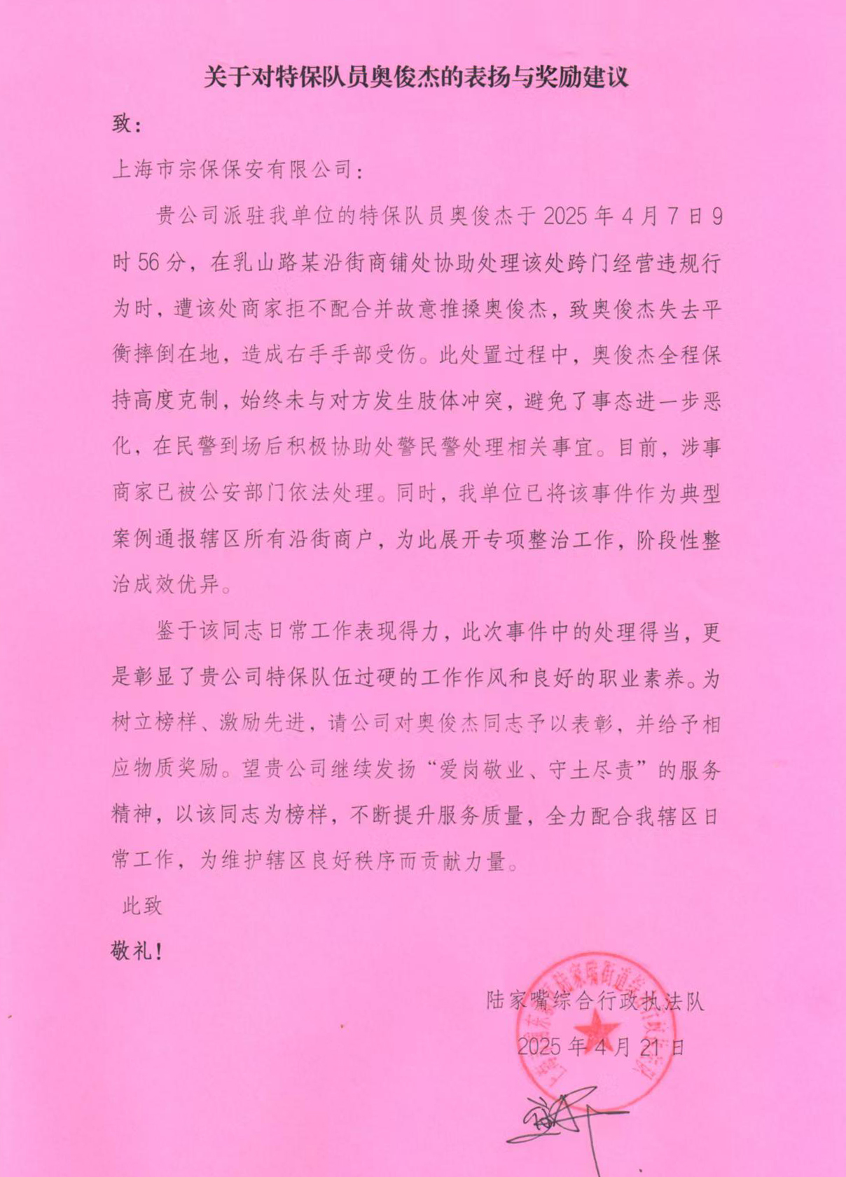 近日,宗保公司駐浦東新區陸家嘴社區市容項目員工奧俊杰因在工作中表現出高度的忍辱克制精神,受到陸家嘴綜合行政執法隊的贊揚和獎勵。