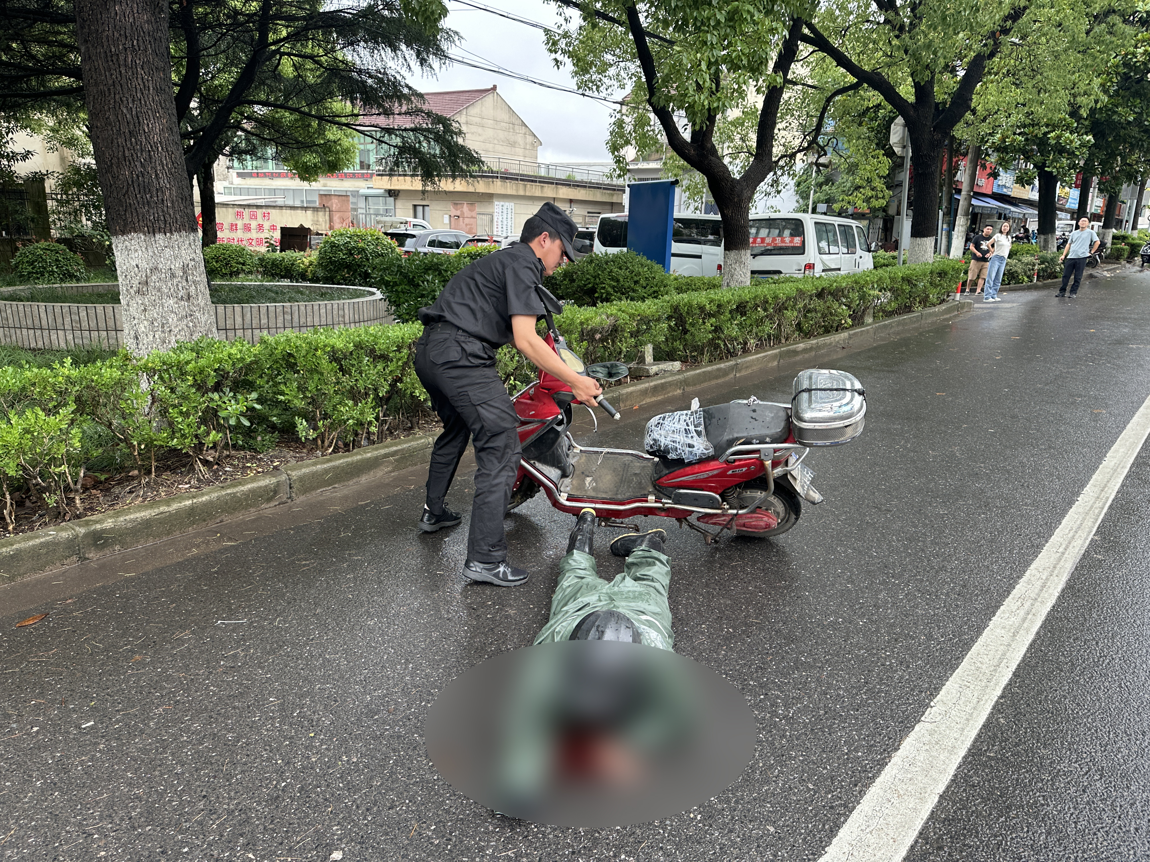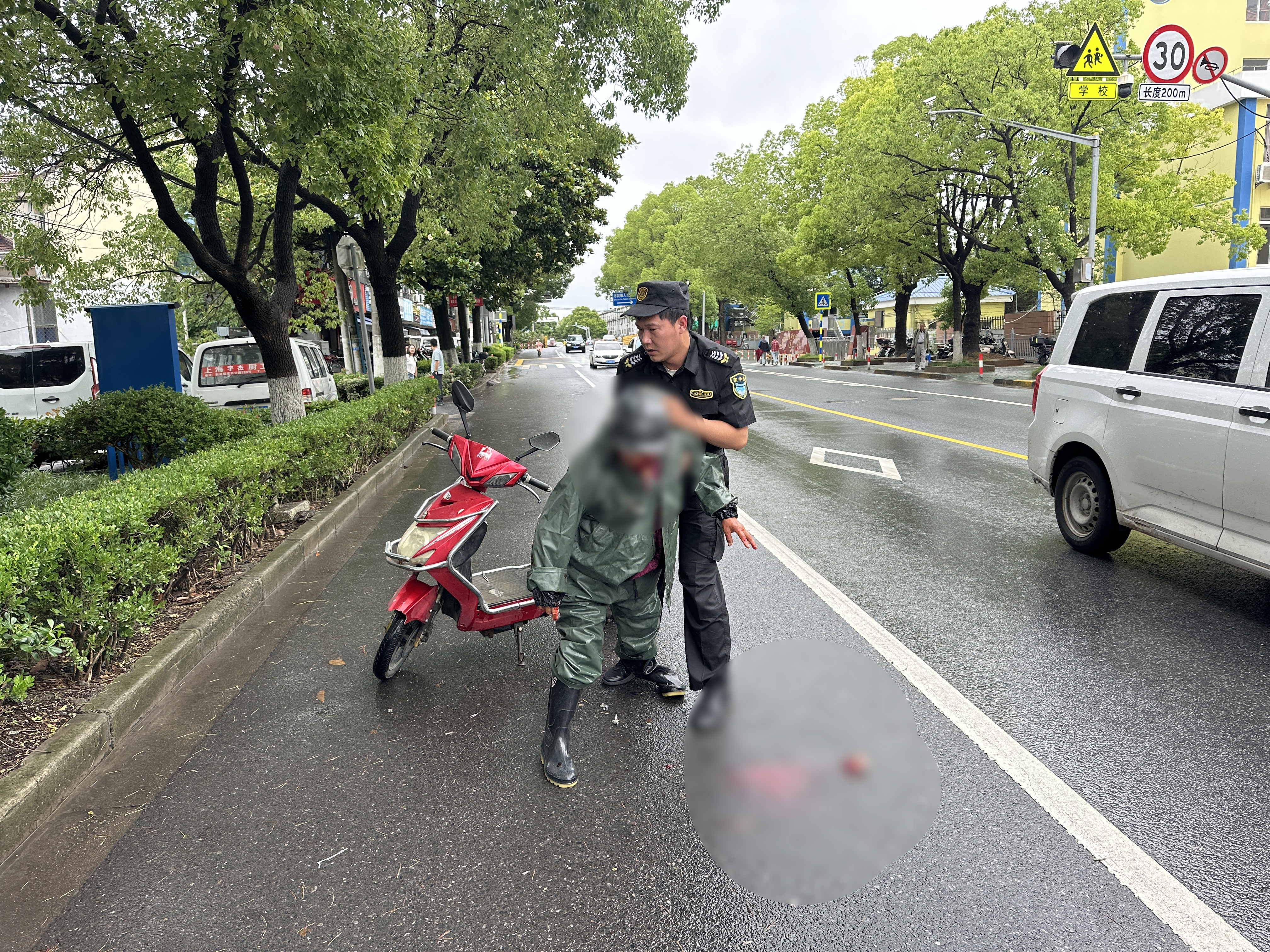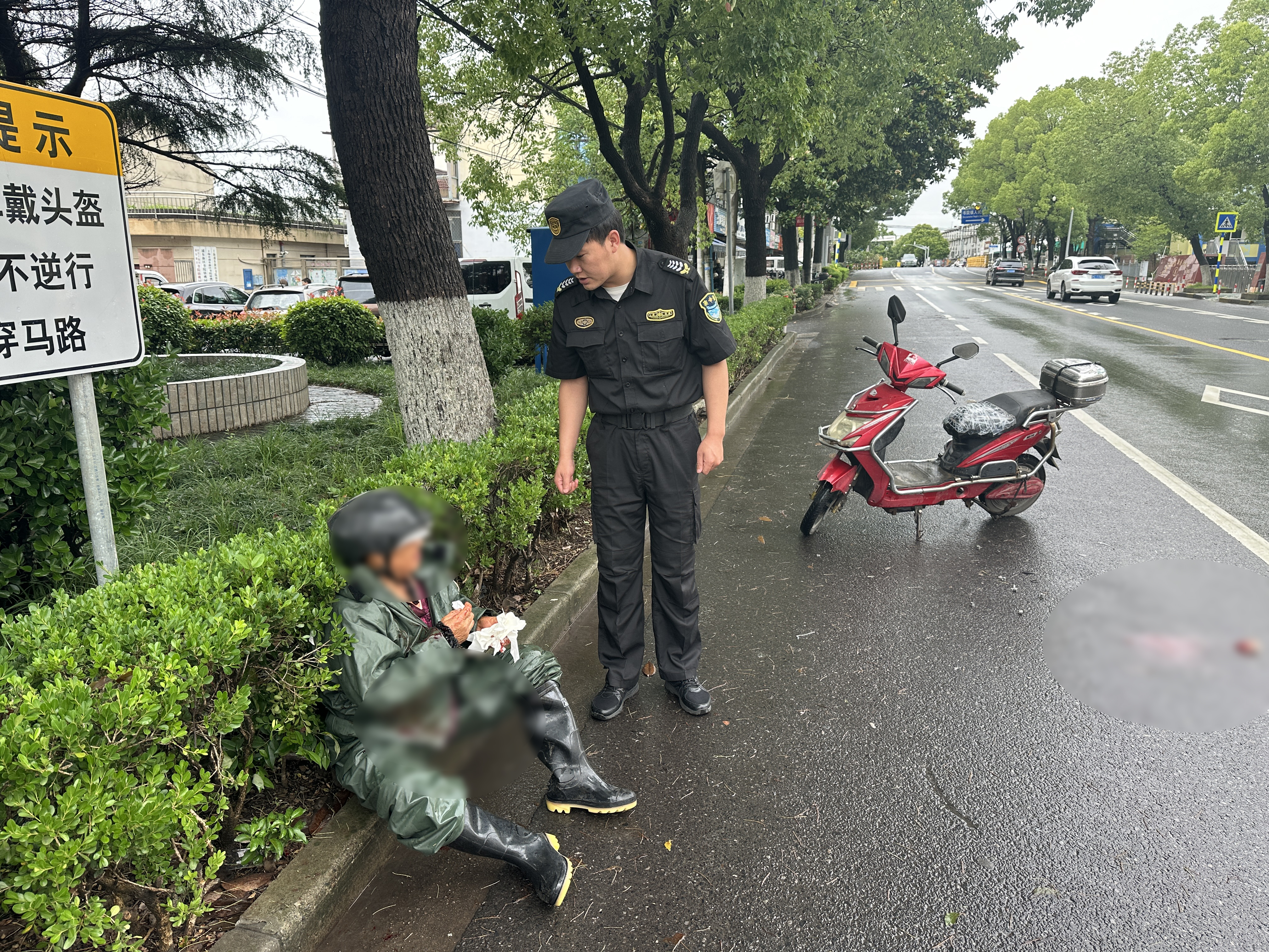當日9:35,魏正斌在老蘆公路新鵬路交叉口巡查時(shí),發(fā)現一位老人騎電動(dòng)車(chē)不慎摔倒在地,臉部受傷,鮮血直流,沉重的電動(dòng)車(chē)還壓在老人的身上,情況十分危急。