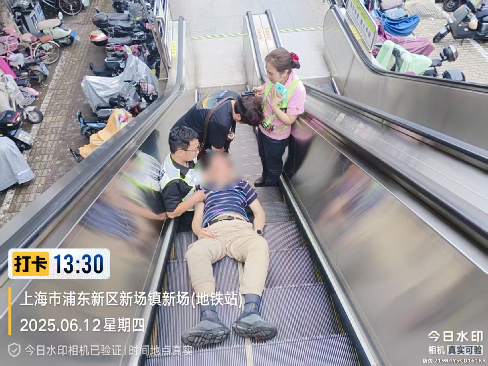 當日13:25,正在16號線(xiàn)新場(chǎng)地鐵站2號口附近巡邏的公司員工翟佳明,突然聽(tīng)到一陣急促的喊叫聲,來(lái)不及多想的他便立即循聲跑去。
