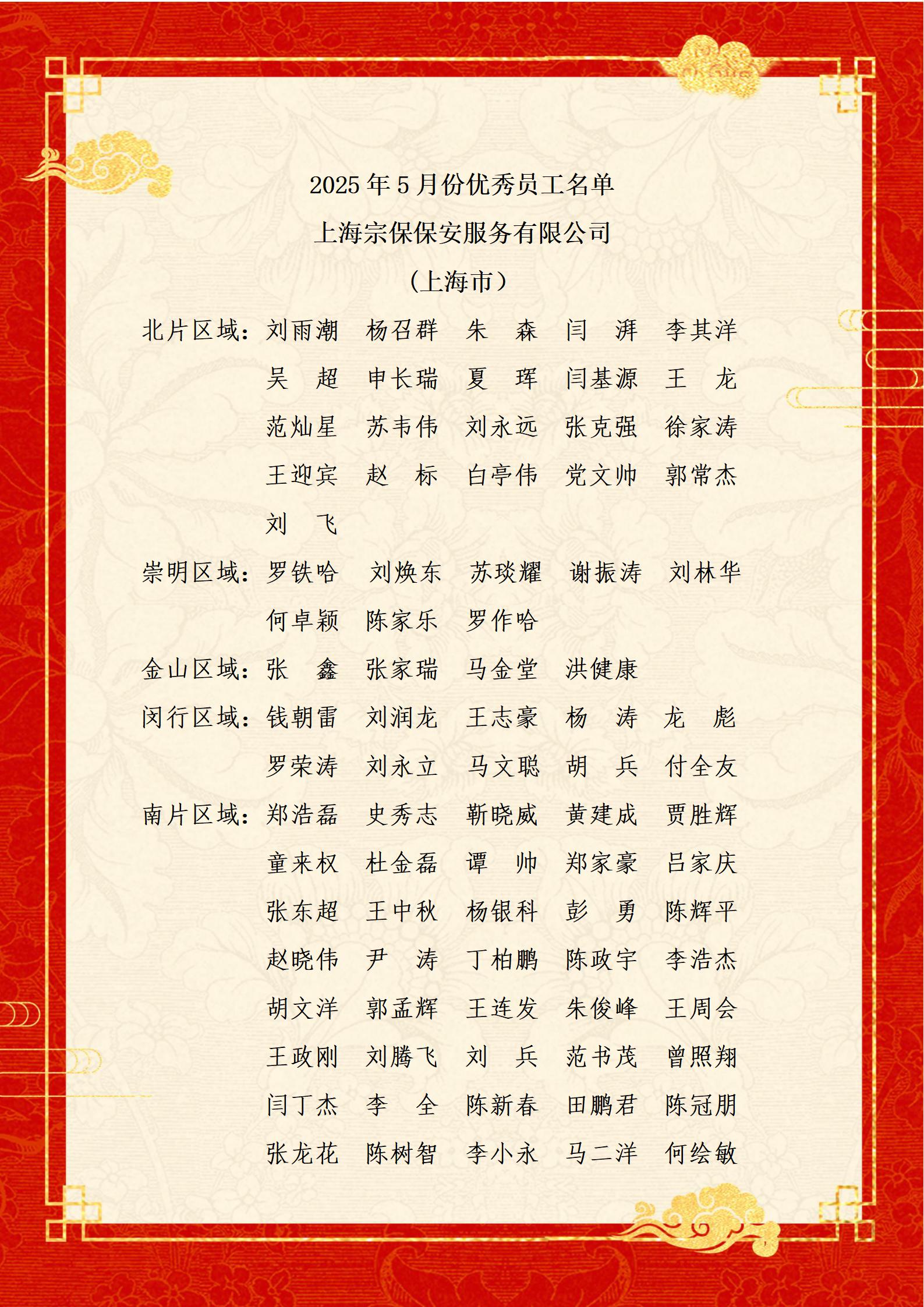 5月份,公司廣大員工根據甲方的任務(wù)要求,按照公司的部署安排,認真踐行公司“誠信為本 服務(wù)至上”的經(jīng)營(yíng)理念,甘于擔當、善于作為,助力完成了2025HADO世冠杯暨波動(dòng)虛擬運動(dòng)嘉年華安保任務(wù),全力配合甲方做好了城市管理輔助、治安巡邏聯(lián)防、物業(yè)服務(wù)保障、生態(tài)環(huán)境保護、高鐵線(xiàn)路巡防、社區消防應急等工作。期間,涌現出了一批盡心履責、崗位建功、拾金不昧、熱心助人的優(yōu)秀員工和先進(jìn)典型。