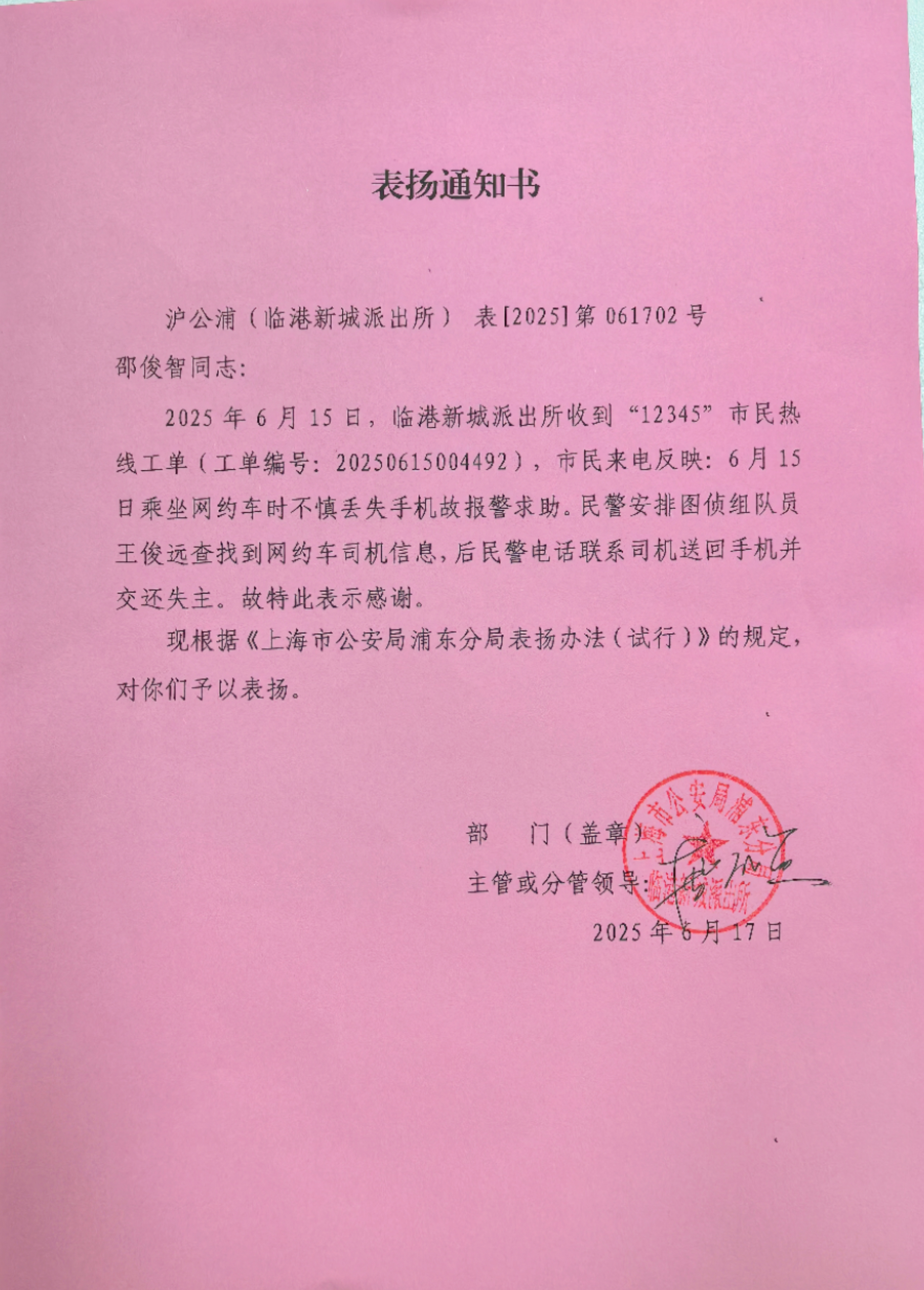6月15日,宗保公司駐浦東新區臨港新城派出所輔助項目員工王俊遠協(xié)助民警幫助市民張先生找回丟失手機,受到張先生致電上海政務(wù)服務(wù)便民熱線(xiàn)12345點(diǎn)名贊揚。