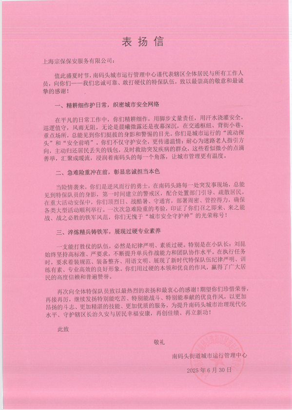 6月30日,宗保公司收到浦東新區南碼頭街道城市運行管理中心的表?yè)P信,感謝公司對南碼頭城市運行管理中心工作的大力支持和積極配合,贊揚公司員工勇于擔當、素質(zhì)過(guò)硬,為提升南碼頭城市治理現代化水平、守護轄區長(cháng)治久安與居民幸福安康付出的辛勤努力。(供稿人:康占峰)