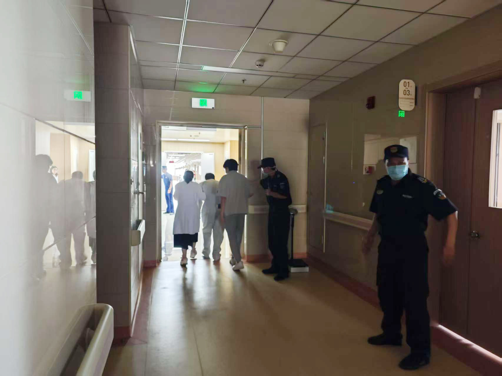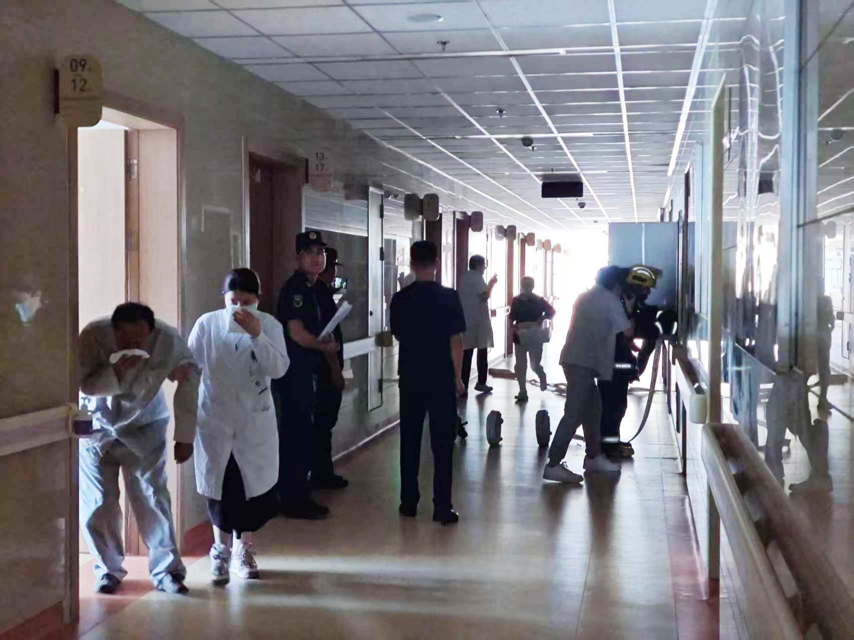 隨后,模擬住院部發(fā)生火情。隨著(zhù)消防警報響起,公司安保員立刻攜帶滅火器趕赴火情現場(chǎng)展開(kāi)撲救,并熟練地連接好消防栓水帶,對準起火源進(jìn)行噴射,有效控制火勢蔓延。與此同時(shí),緊密配合醫護人員,引導醫患人員彎腰低姿、濕毛巾捂口鼻撤離,使用擔架、輪椅將行動(dòng)不便的患者安全疏散至廣場(chǎng)。