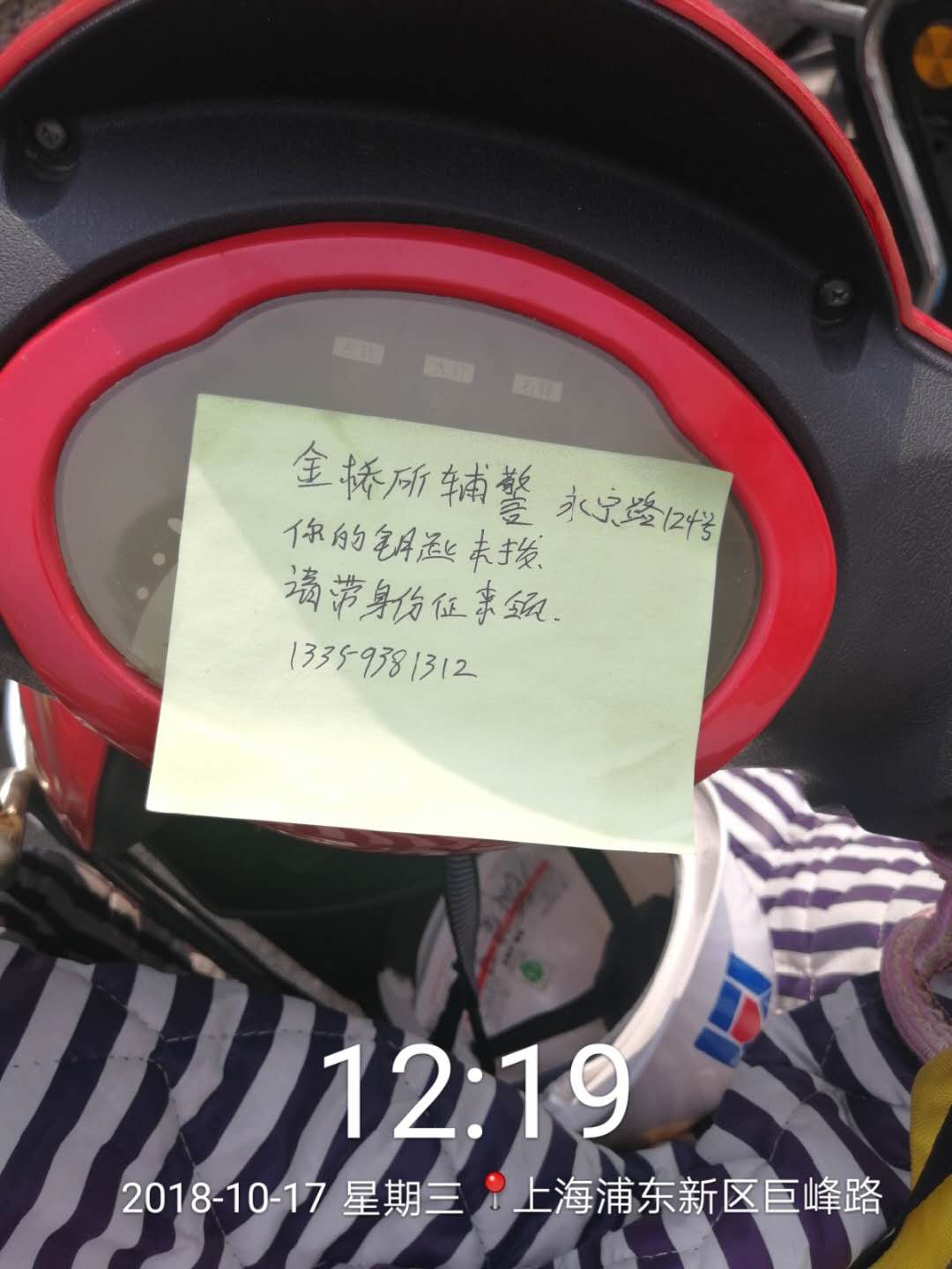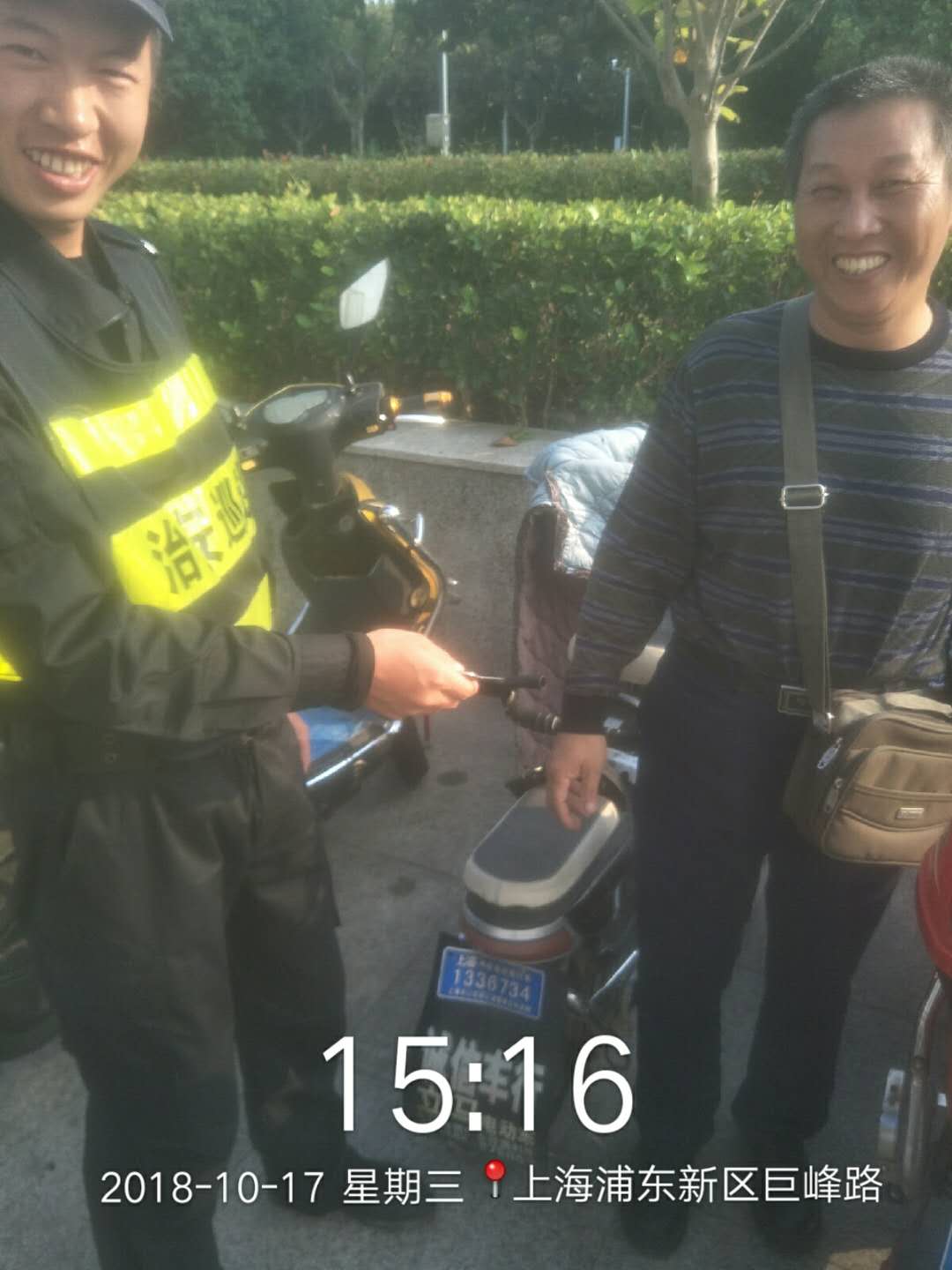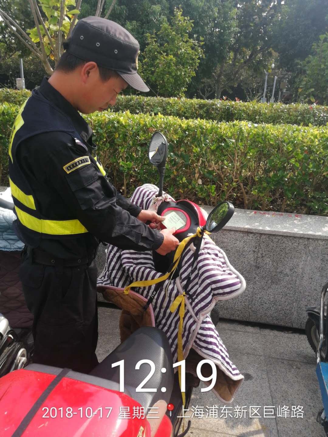 2018年10月17日,宗保公司金橋所輔警項目隊員王峰峰、陳友明在申江路執勤期間,發(fā)現一輛電動(dòng)車(chē)鑰匙沒(méi)有拔,而電動(dòng)車(chē)主人也沒(méi)有在現場(chǎng)。兩人上報當日值班后,為了防止電動(dòng)車(chē)丟失,拔掉鑰匙暫時(shí)保管,并用便簽紙寫(xiě)了自己聯(lián)系方式貼于電動(dòng)車(chē)儀表盤(pán),提醒車(chē)主如何領(lǐng)取鑰匙。