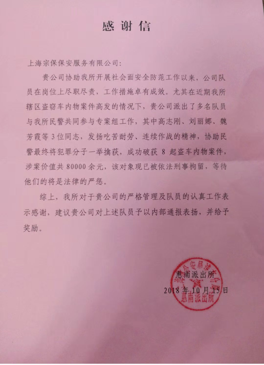 惠南派出所對宗保公司的嚴格管理及對他們工作上的大力支持深表感謝,對隊員們的認真工作表示認可及贊揚。事后惠南派出所還特意向宗保公司寫(xiě)來(lái)了感謝信。