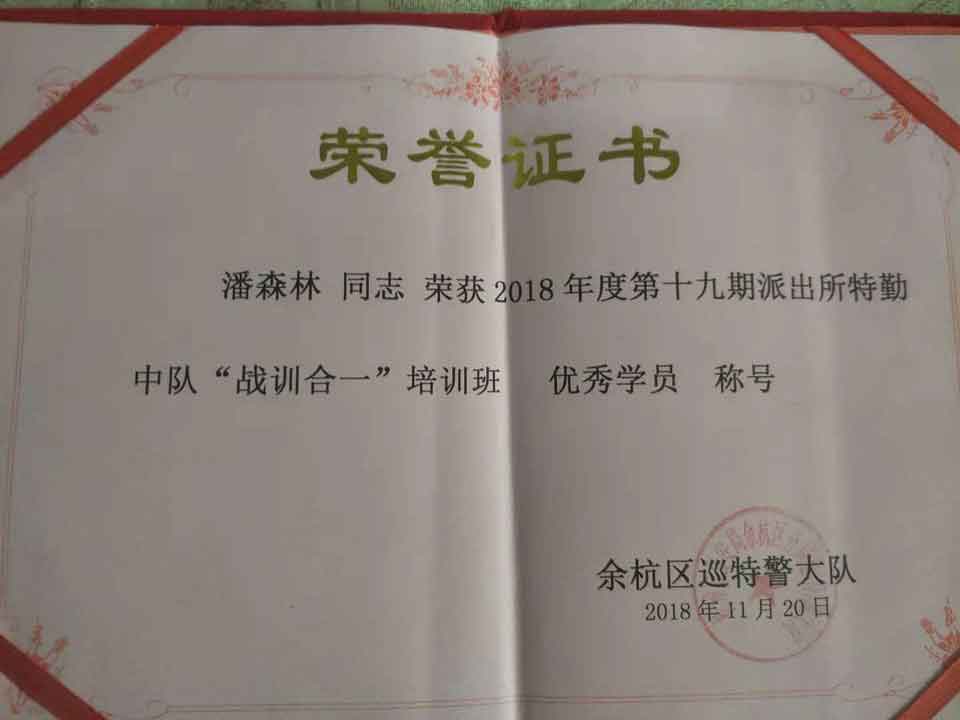 功夫不負有心人,經(jīng)過(guò)嚴格的理論考試和實(shí)戰考核,張小龍和潘森林二位學(xué)員表現尤為突出,榮獲了余杭區巡特警大隊頒發(fā)的榮譽(yù)證書(shū) —— 2018年度第十九期派出所特勤中隊“戰訓合一”培訓班優(yōu)秀學(xué)員稱(chēng)號。