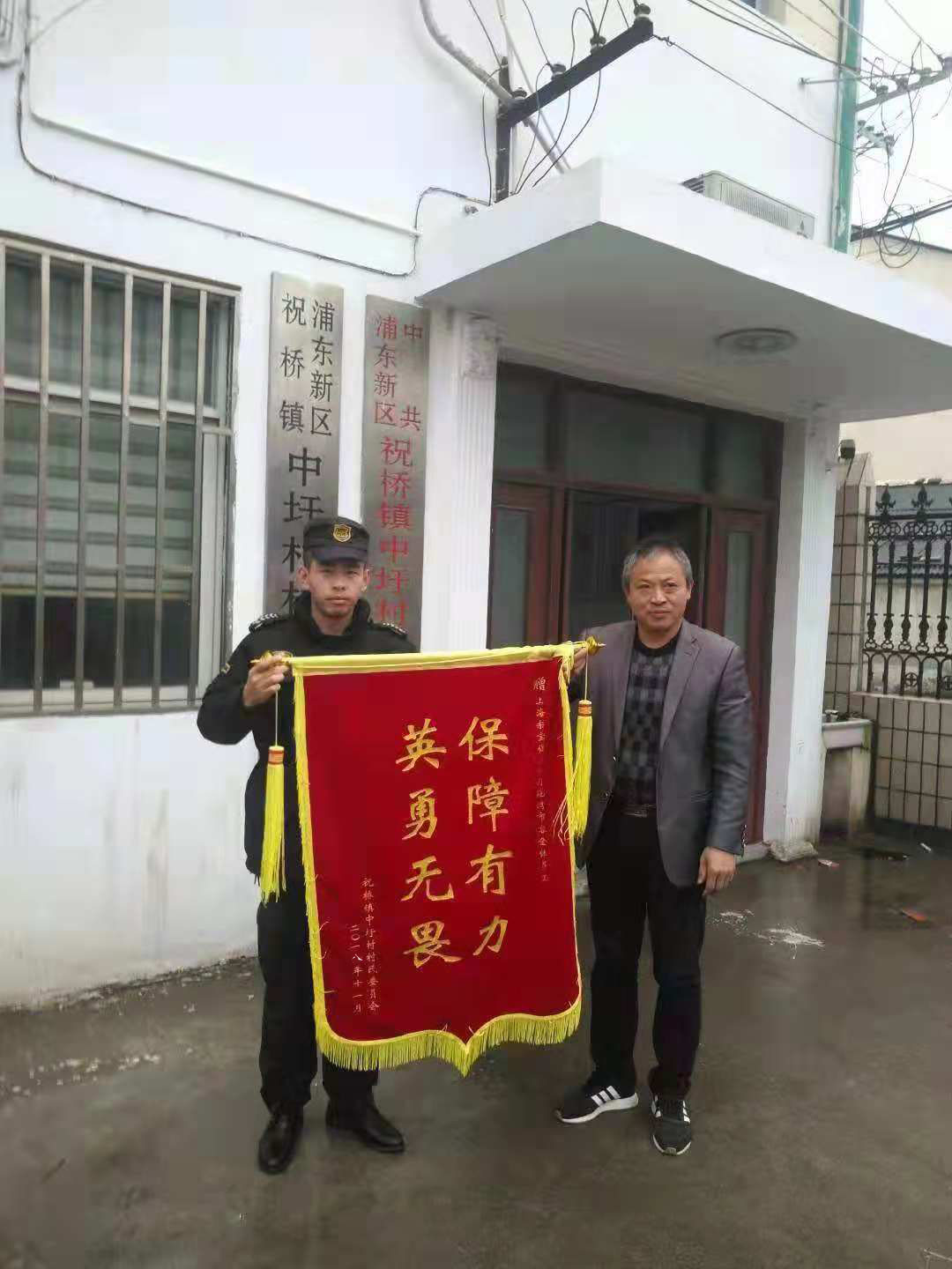 2018年11月30日,祝橋鎮中圩村村長(cháng)將手中的錦旗贈予宗保駐祝橋市容項目隊員手上。錦旗上面赫然寫(xiě)著(zhù)“保障有力,英勇無(wú)畏”幾個(gè)金燦燦的大字,感謝宗保公司祝橋市容項目保障火災現場(chǎng)秩序及英勇協(xié)助救火。