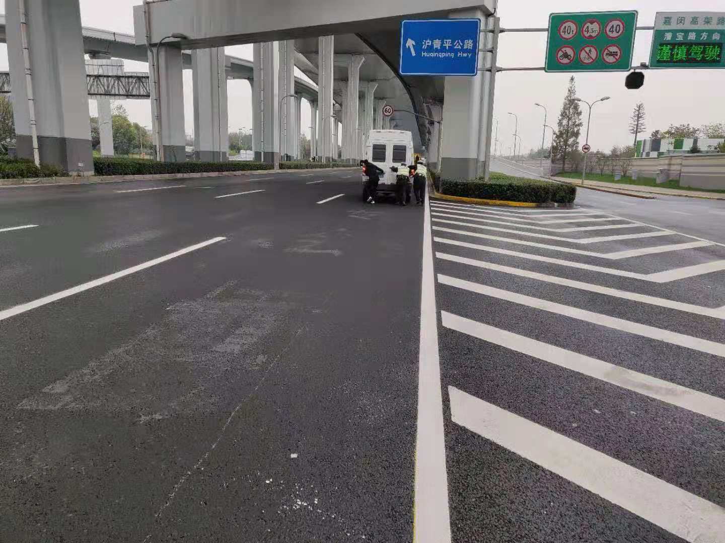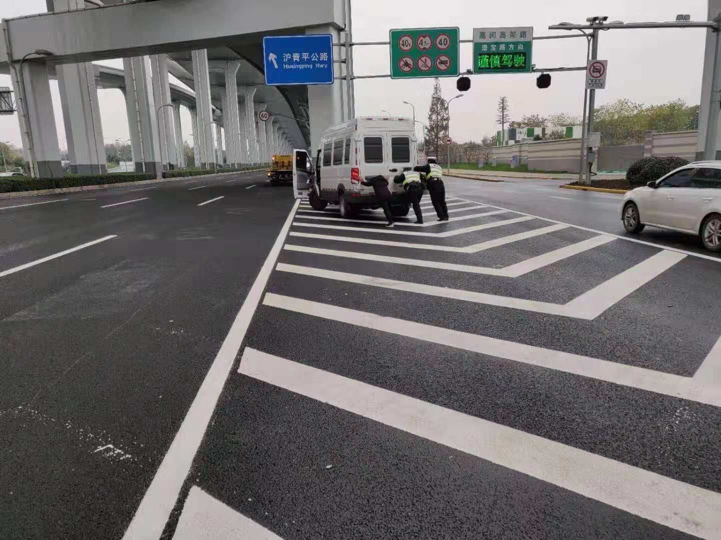 2018年12月9日,宗保駐閔行輔警項目隊員,將拋錨白色依維柯迅速撤離機動(dòng)車(chē)道,保障道路通暢。