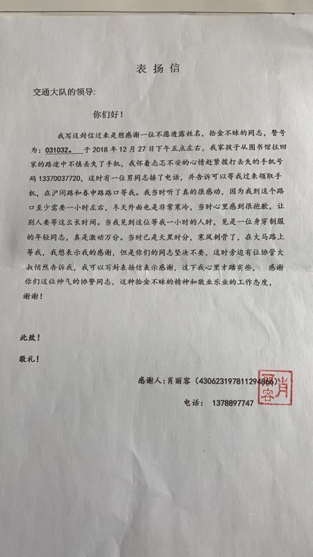近日,閔行交通大隊收到一封表?yè)P信,來(lái)自于失主肖女士的,是對宗保駐閔行輔警項目鐘雨江拾金不昧的高尚品質(zhì)予以贊揚并表示感謝。