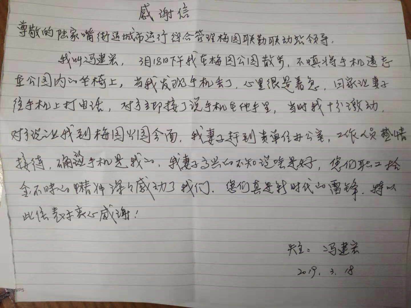 下午15:00時(shí),失主老奶奶至城管中隊,經(jīng)核對無(wú)誤,城管隊員將手機交還給失主,老奶奶再三表示感謝,并要支付酬金給撿到手機的特保隊員。隊員當即表示不用酬謝。