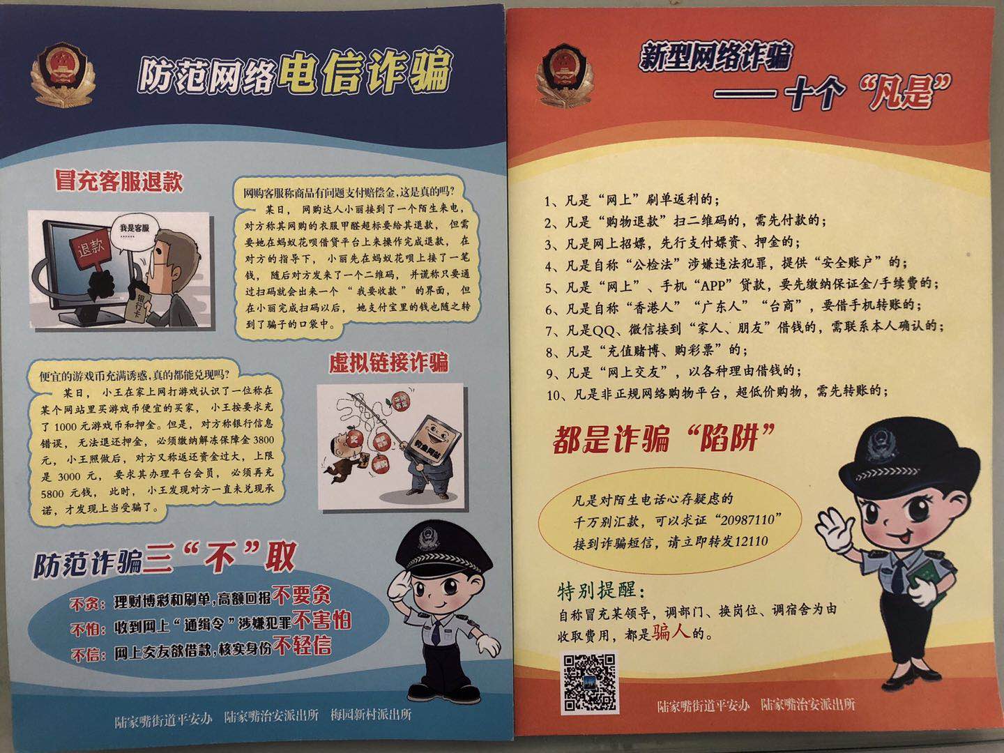 為預防和減少電信詐騙案件的發(fā)生,提高群眾防范電信、網(wǎng)絡(luò )詐騙意識,陸家嘴治安派出所在3月份組織開(kāi)展防范電信詐騙宣傳月活動(dòng)。