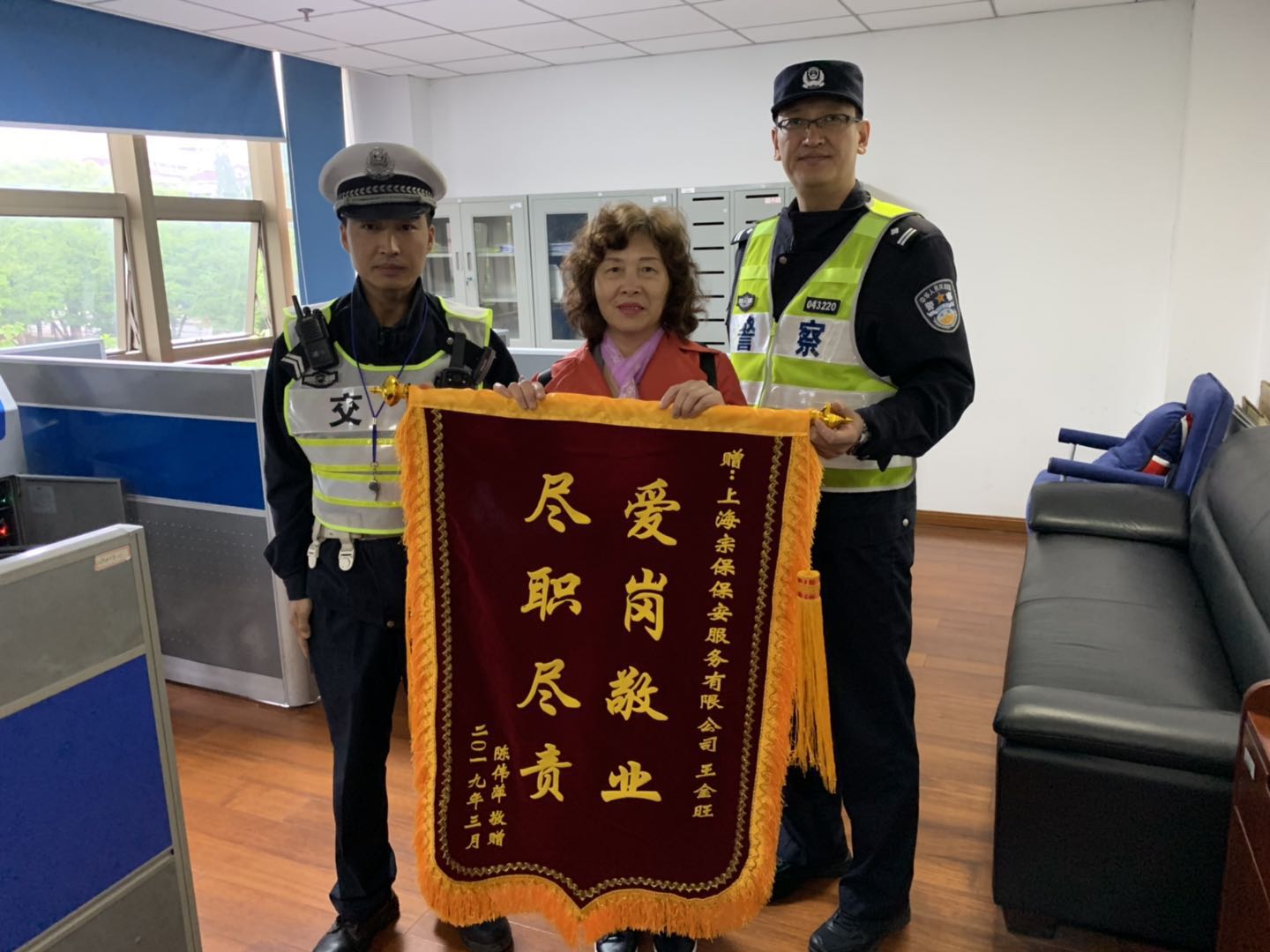 2019年4月26日,陳阿姨將一面繡著(zhù)“愛(ài)崗敬業(yè)、盡職盡責”8個(gè)字的錦旗送到閔行虹橋龍柏所感謝宗保輔警隊員王金旺。