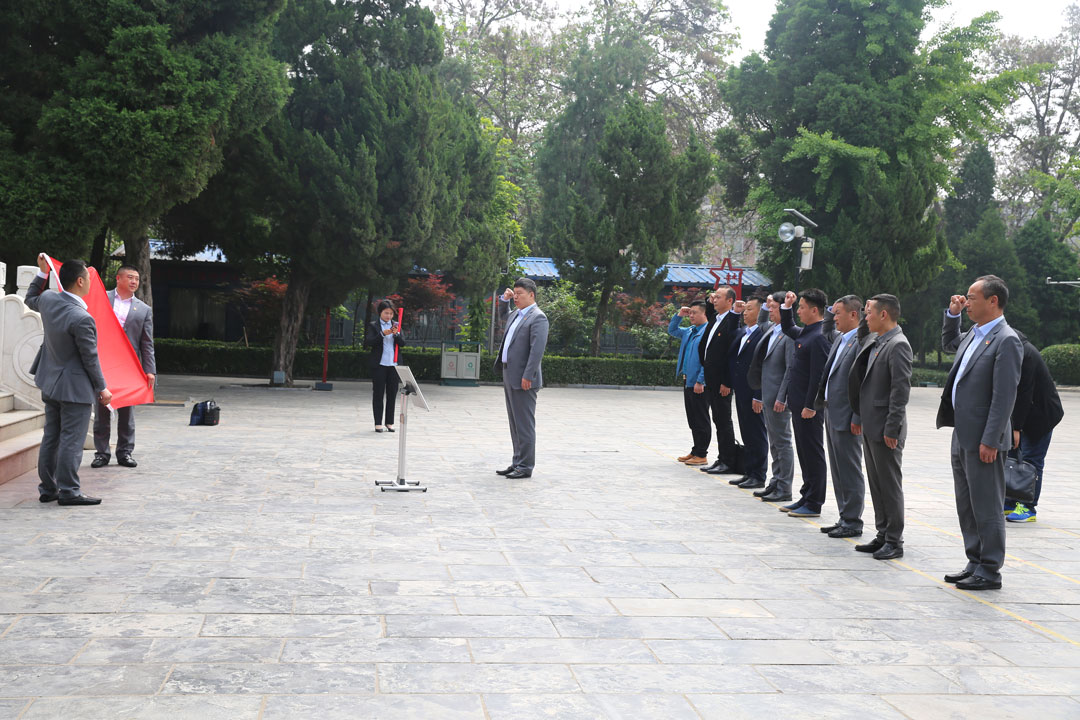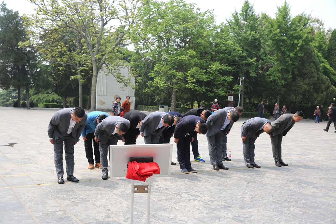 白玉石碑,巍然聳立;蒼松翠柏,莊嚴肅穆。在焦裕祿烈士陵園前,全體同志懷著(zhù)無(wú)比崇敬的心情向焦裕祿烈士敬獻花籃并鞠躬致敬,并重溫入黨誓詞。
