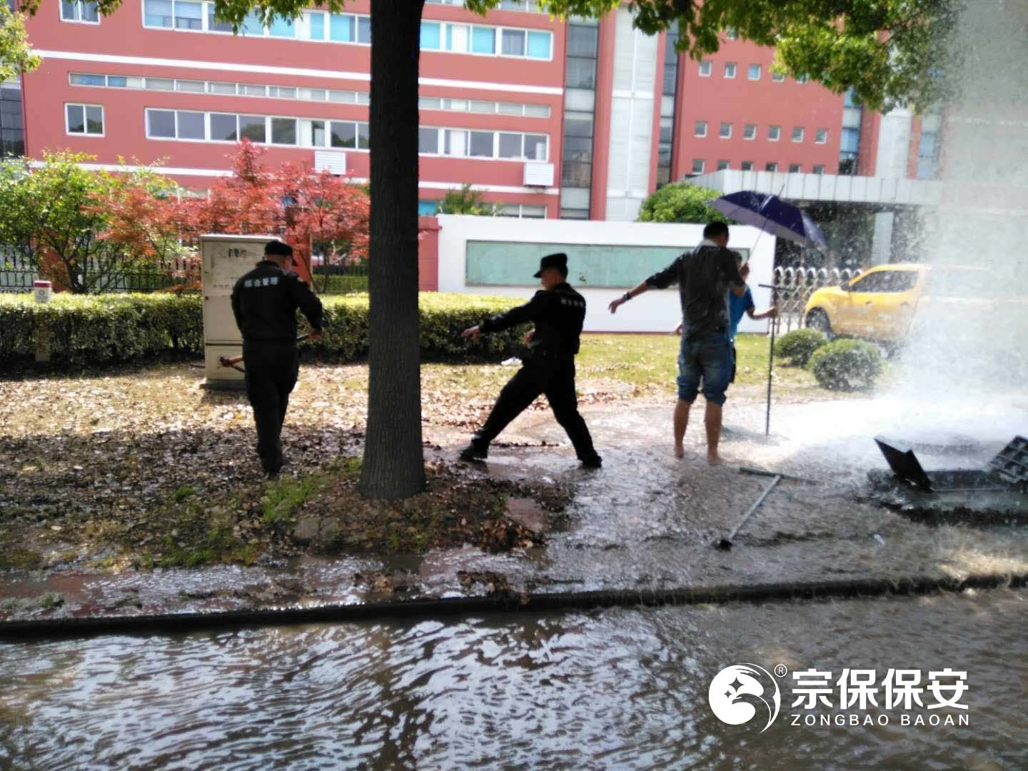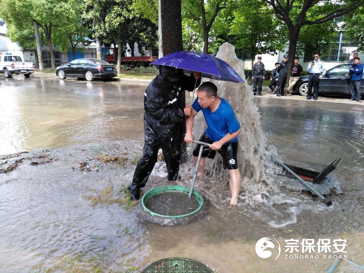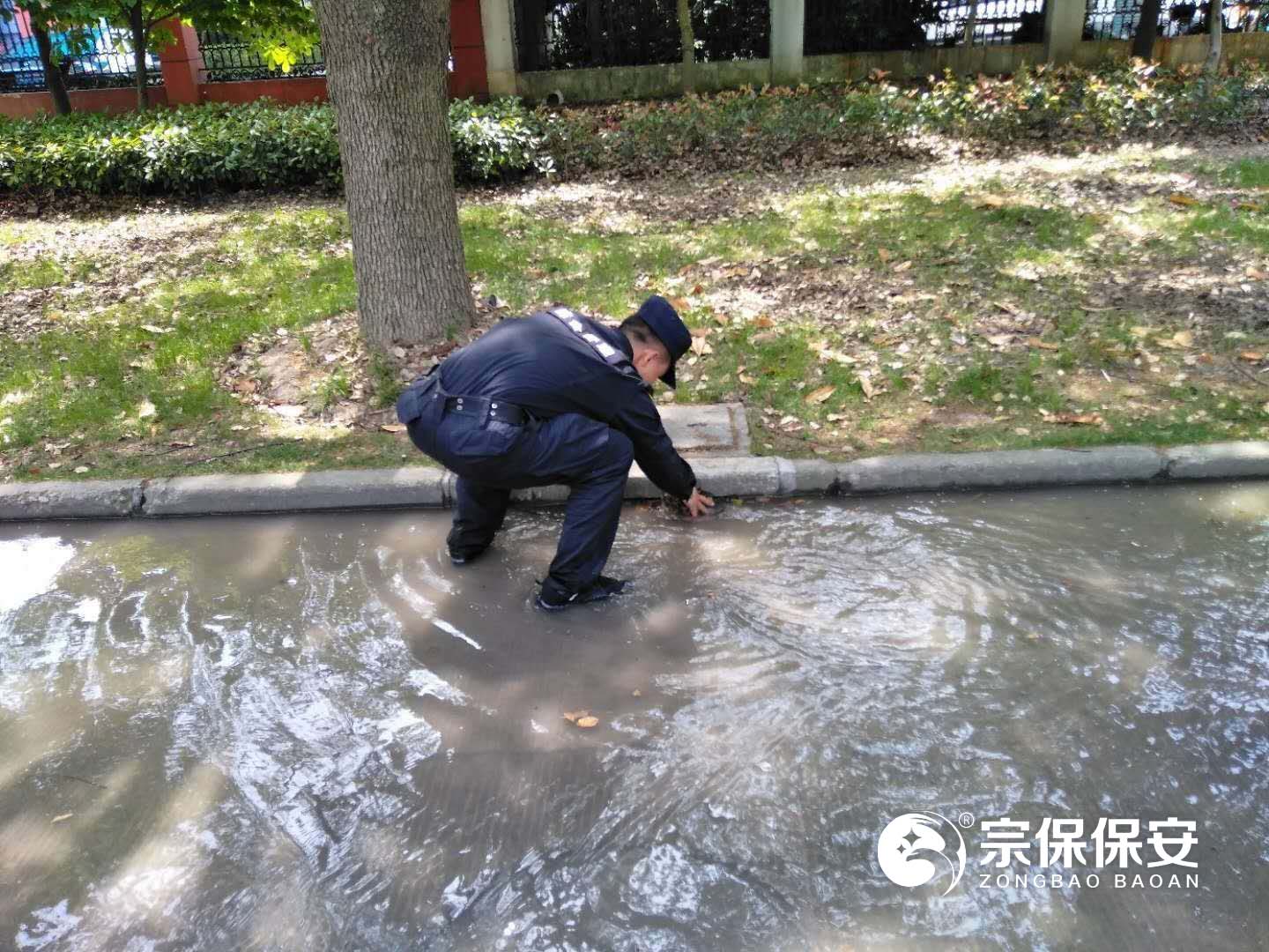現場(chǎng)由于水管?chē)乐仄屏?,造成路面大量積水,影響過(guò)往車(chē)輛和行人通行。宗保隊員打開(kāi)隨騎電瓶車(chē)警燈現場(chǎng)指揮交通,并對路邊堵塞雨水篦子進(jìn)行疏通,及時(shí)排掉路面積水。