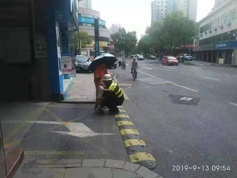 當天10:00,張艮振和岳壯在邱山大街與星火南路日常巡查時(shí),發(fā)現一個(gè)小孩獨自沿馬路邊走邊哭。小張趕緊走過(guò)去,詢(xún)問(wèn)孩子爸爸媽媽在哪里,家住在哪里,知道不知道家人的聯(lián)系號碼,小孩子不說(shuō)話(huà),只是一直在哭。小張和小岳一邊安撫孩子的情緒,一邊尋找其親屬。20分鐘后,仍然沒(méi)有找到其家人,孩子又開(kāi)始哭鬧起來(lái)。于是兩人就帶著(zhù)孩子來(lái)到便利店,買(mǎi)瓶旺仔牛奶給小孩喝,逗孩子說(shuō)笑,孩子不再哭鬧情緒穩定了下來(lái)。正在這時(shí),一名男子步履慌張,神色焦急地趕來(lái)。小孩一見(jiàn)到來(lái)人就哭著(zhù)跑了過(guò)去,原來(lái)是孩子粗心的爸爸。他帶著(zhù)孩子逛市場(chǎng),因其他事只顧打電話(huà),疏忽把孩子走丟了。他發(fā)現孩子不見(jiàn)了,自己也心急火燎地四處找。